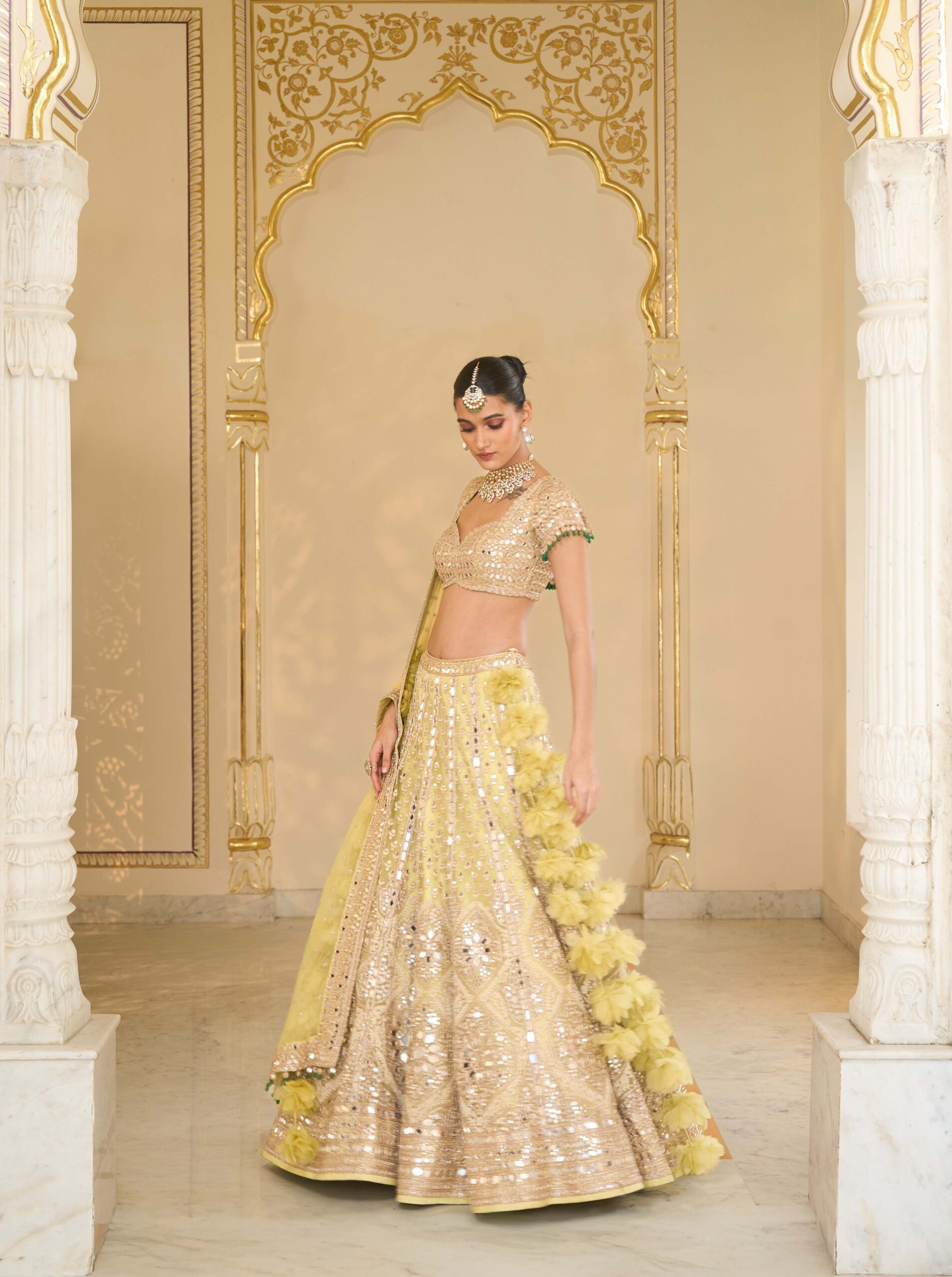 The lehenga flows beautifully with a generous flare that enhances movement and adds regal volume. Crafted from embroidered net, it showcases intricate handwork arranged to create a harmonious visual pattern. The piece is finished with handcrafted organza flower tassels, adding a soft, artistic touch to the overall design.