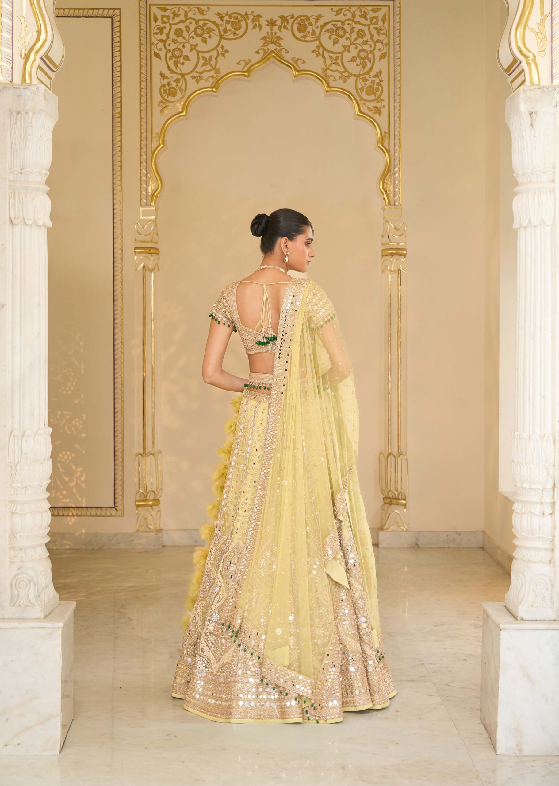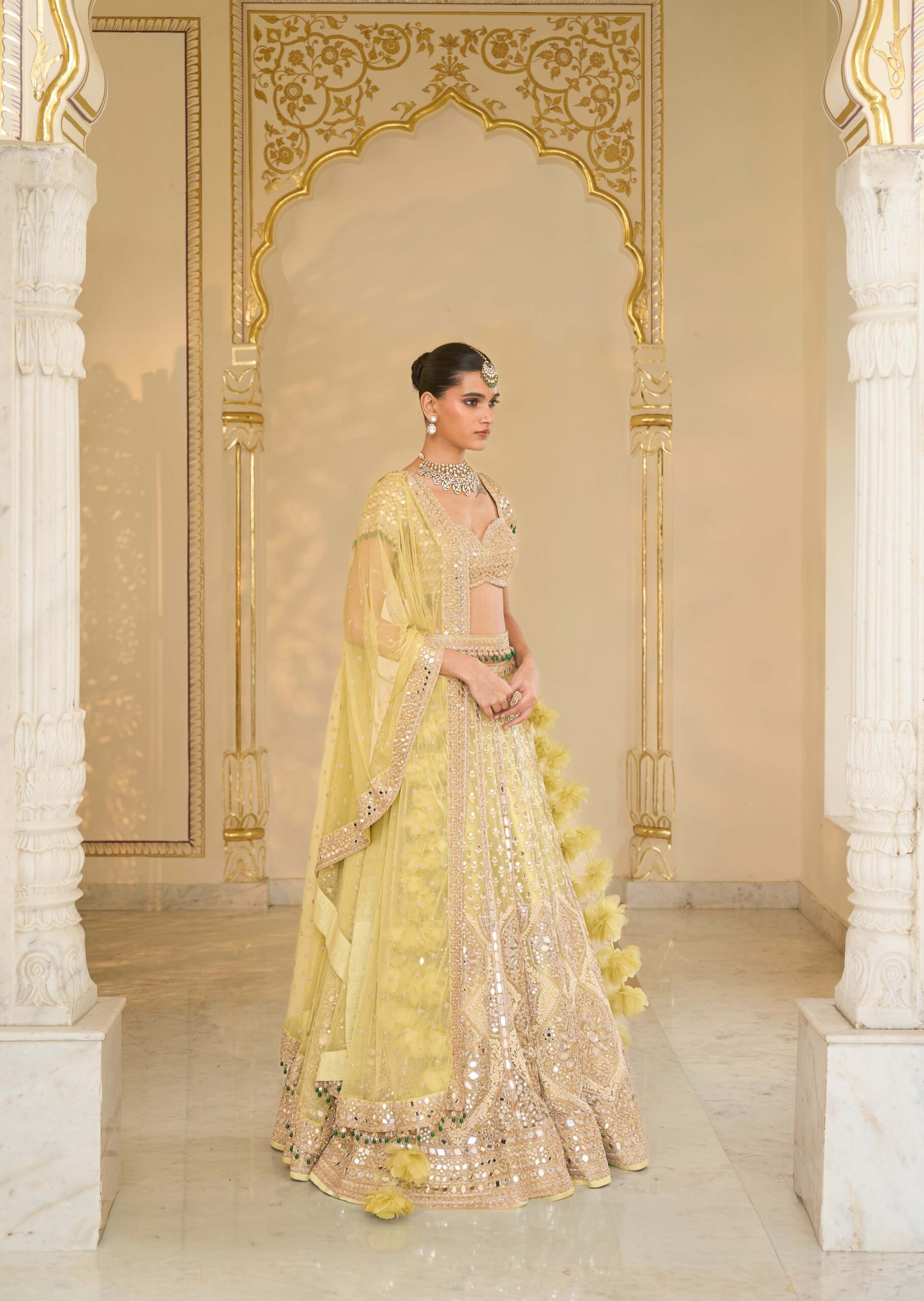 A mint green lehenga and blouse ensemble adorned with detailed hand embroidery, paired with a delicately embellished dupatta for an elegant wedding look.