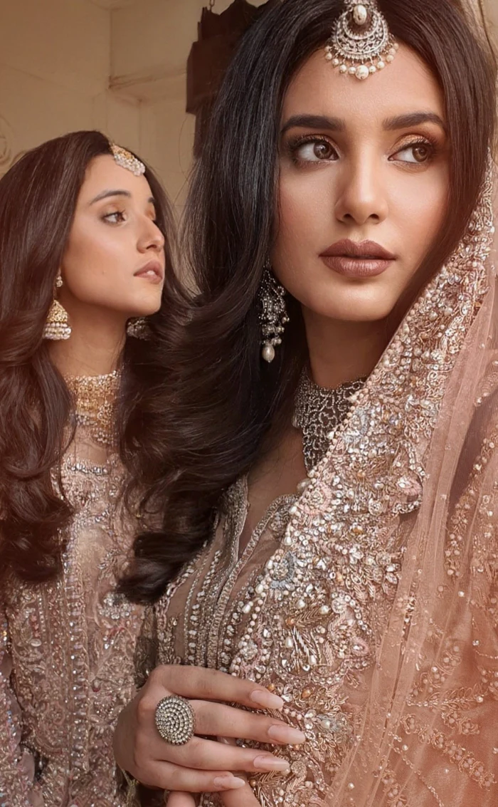 The ensemble is paired with a breathtaking chiffon dupatta featuring heavily hand-embroidered borders that mirror the gown’s intricate motifs. The dupatta adds a glamorous and majestic touch, completing the bridal statement with elegance and refinement.