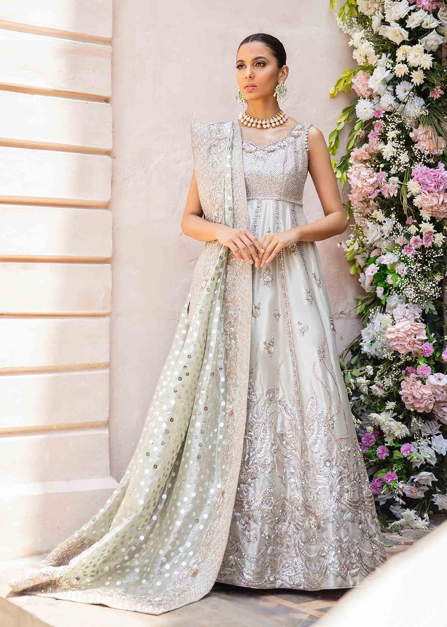 The dupatta is made from misty silver sheer fabric, bordered with detailed silver embellishment and appliqué that complements the maxi. Sequins, beads, and delicate motif placements add soft radiance throughout the veil. Its edges are finished with a katan lining, lending structure while preserving the graceful, fluid drape.
