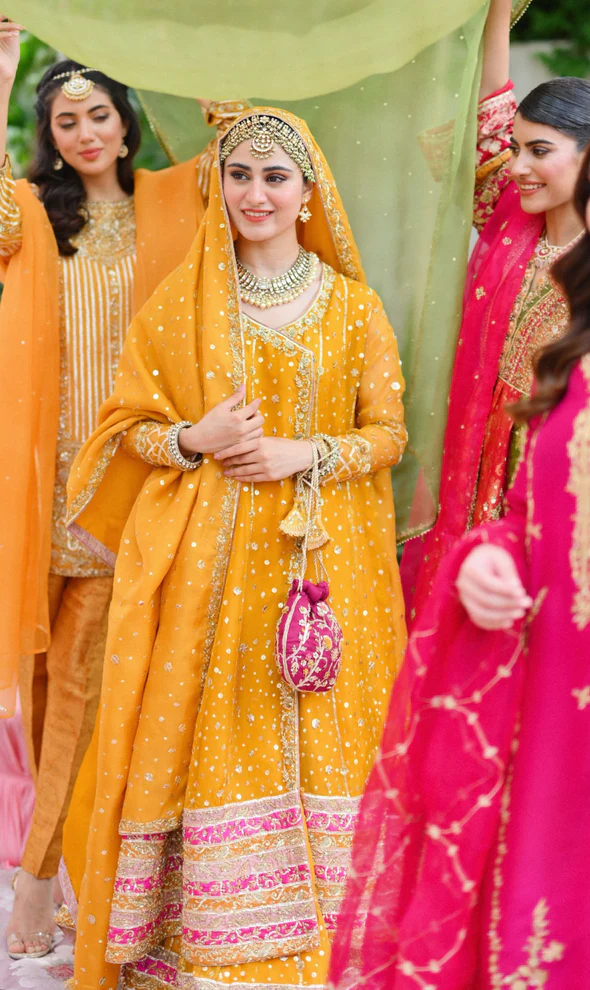 The angrakha is designed in a classic traditional silhouette and brought to life with intricate hand craftsmanship. Detailed embellishment using dabka, naqshi, sequins, gotah, and crystals is meticulously applied across the bodice and panels, creating depth and texture. The overlapping angrakha style adds elegance and structure while maintaining a graceful flow, making it an enduring bridal favorite.