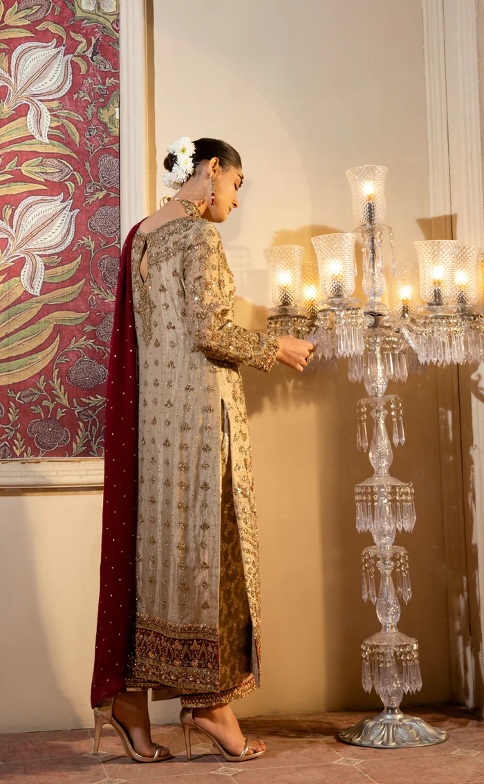 The chiffon dupatta adds softness and fluidity to the outfit. Light in weight and graceful in drape, it complements the floral gold tones beautifully. Subtle handmade embellishment enhances its elegance without overpowering the overall look, completing the ensemble with an airy, refined finish.