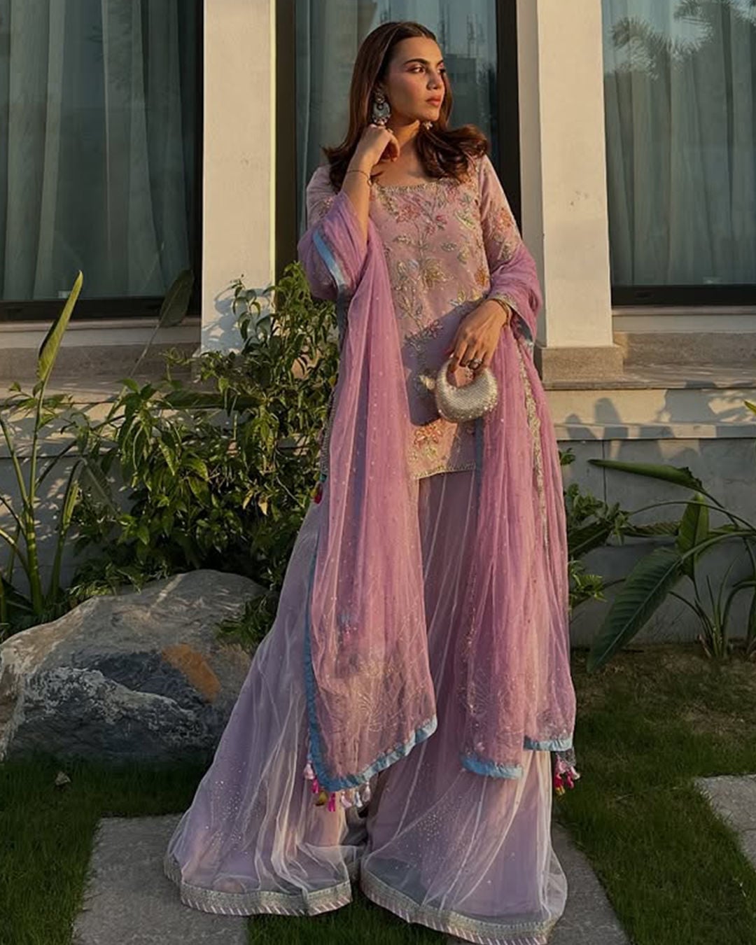 The short shirt and sharara are made from premium blended fabrics, with a lining for the sharara to provide structure and comfort. The dupatta is crafted from sheer matching fabric.