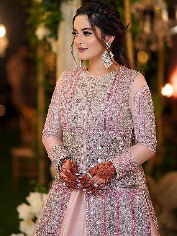 The fully embellished pishwas showcases exquisite handwork, with intricate detailing on the front and subtle light embroidery on the back. Crafted to create a flattering silhouette, the long, flowing design exudes elegance and grace, making it ideal for weddings and grand celebrations.