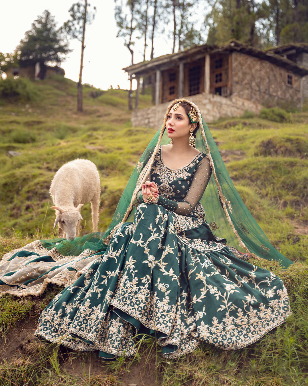 Emerald green bridal ensemble in Korean raw silk, featuring intricate handwork on the kameez, detailed booti embellishment on the gharara and a delicately adorned net dupatta for a luxurious and regal finish.