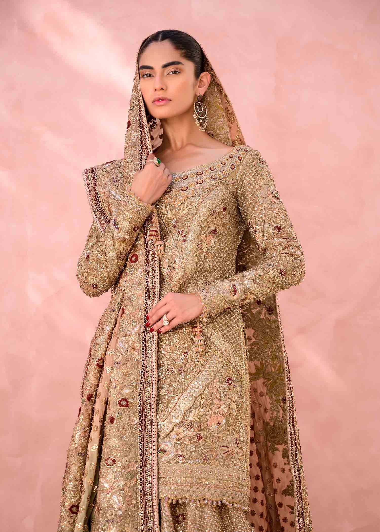 A luminous champagne gold bridal masterpiece, featuring a meticulously worked peplum-style kameez and an expansive, floor-sweeping lehenga adorned with intricate zardozi and crystalline details.