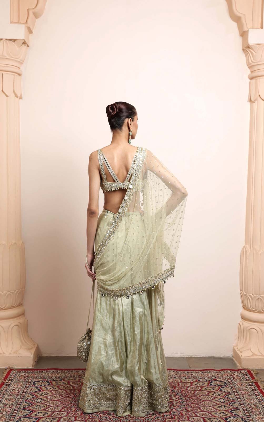 The saree is paired with a beautifully tailored blouse featuring matching hand embroidery. The detailing mirrors the saree’s embellishment style, integrating mirror elements and delicate thread artistry to create a cohesive and elegant finish.