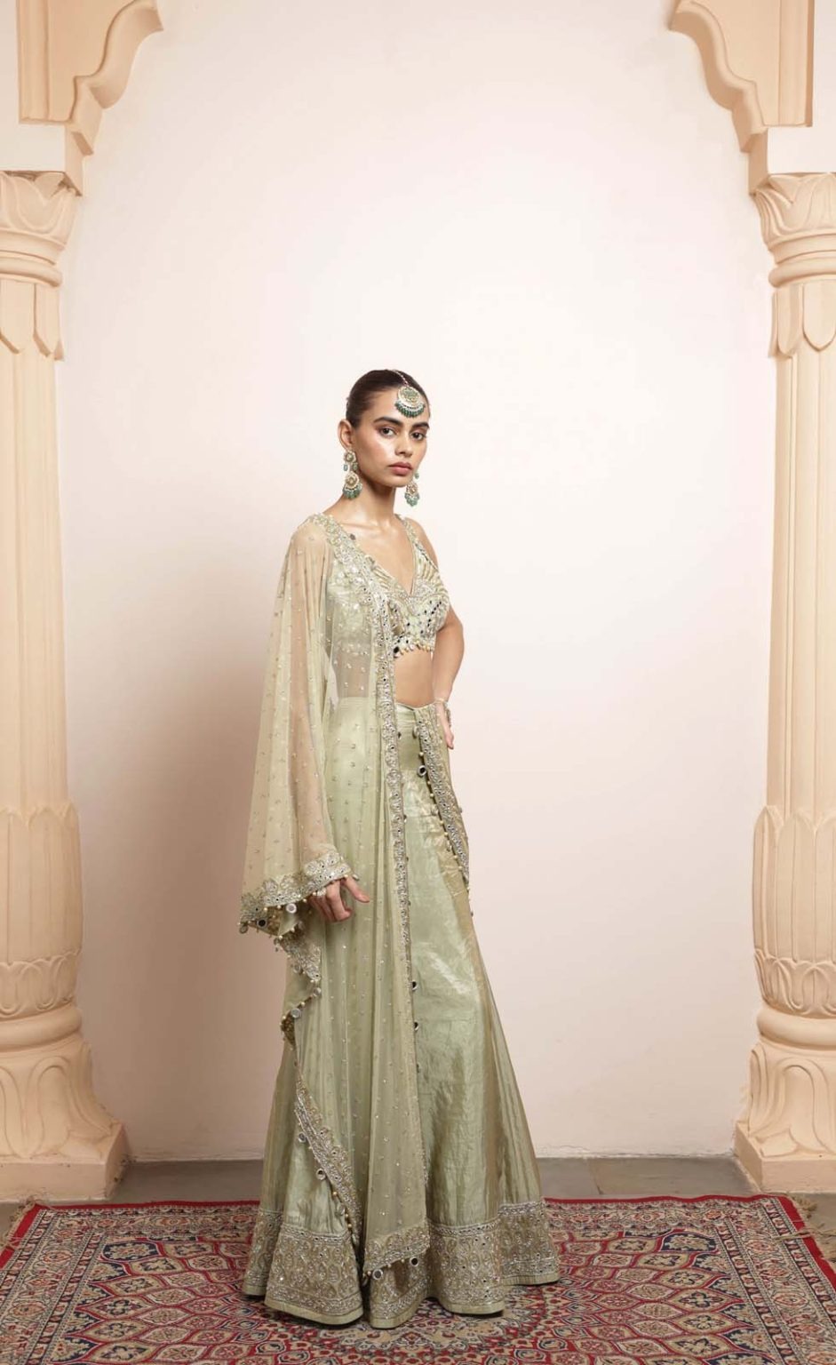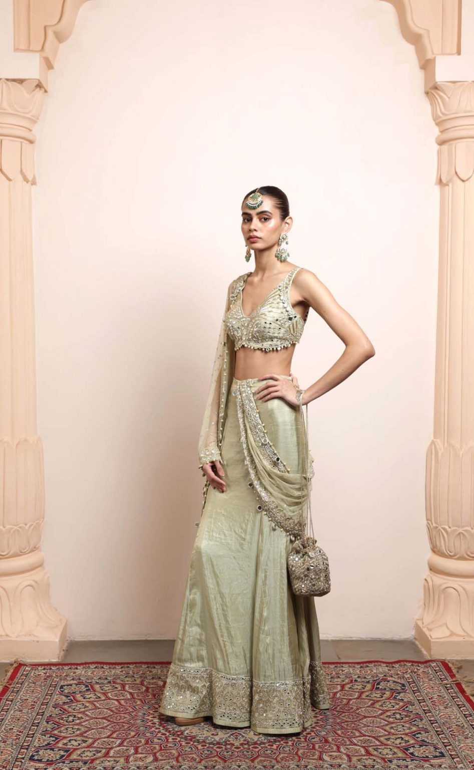 This saree is designed in a radiant sea-green shade using premium tissue fabric that offers a luminous, fluid drape. The pallu showcases an elaborate handcrafted jaal pattern created with paani gold mirror work, cutdana, and kasab detailing. The artistry is meticulously arranged to achieve a luxurious and statement bridal look with refined sparkle.