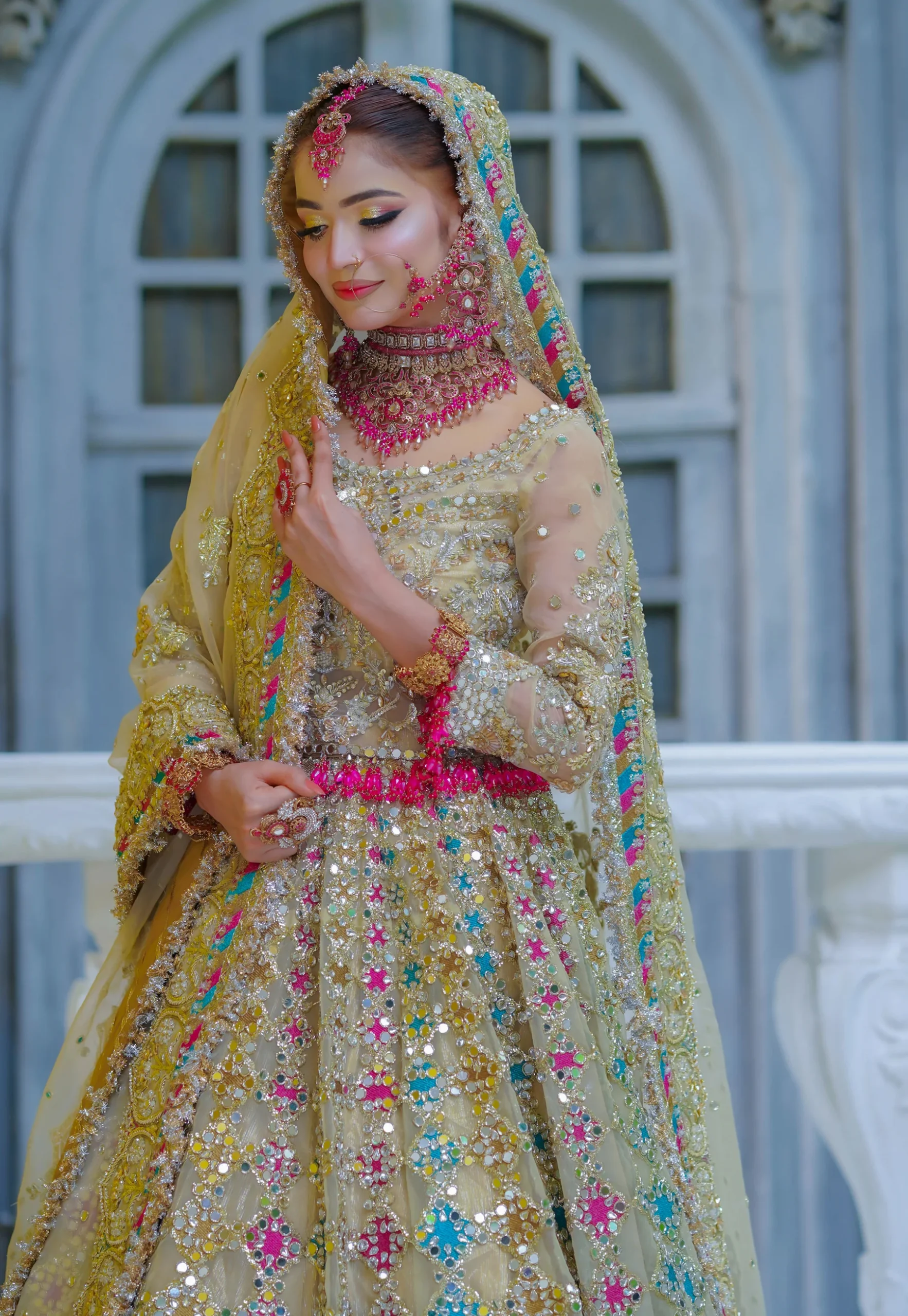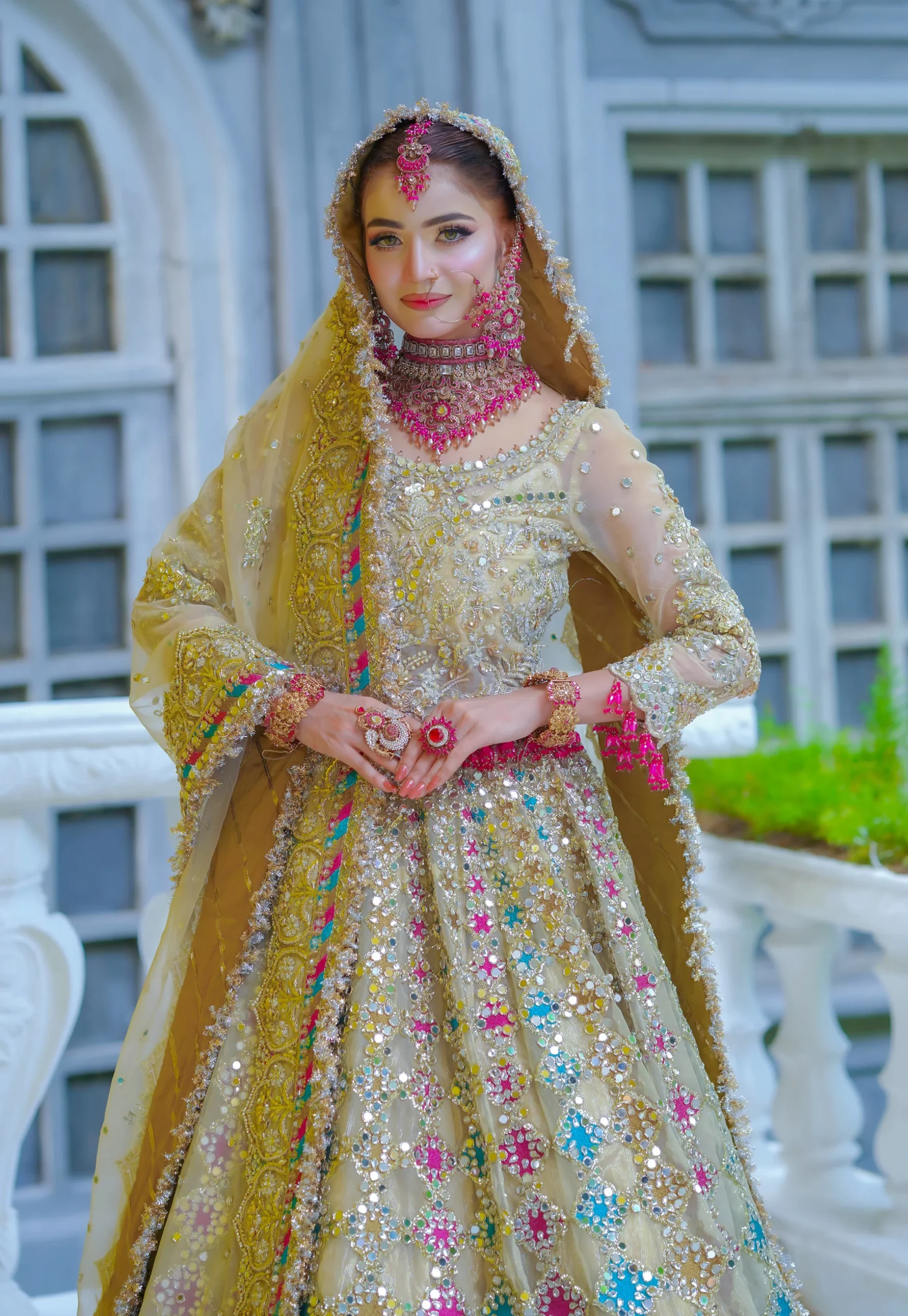 A breathtaking golden beige bridal lehenga adorned with vibrant multicolor mirror embroidery, crystal detailing, and a voluminous flare. This radiant masterpiece blends modern sparkle with timeless Pakistani bridal elegance.
