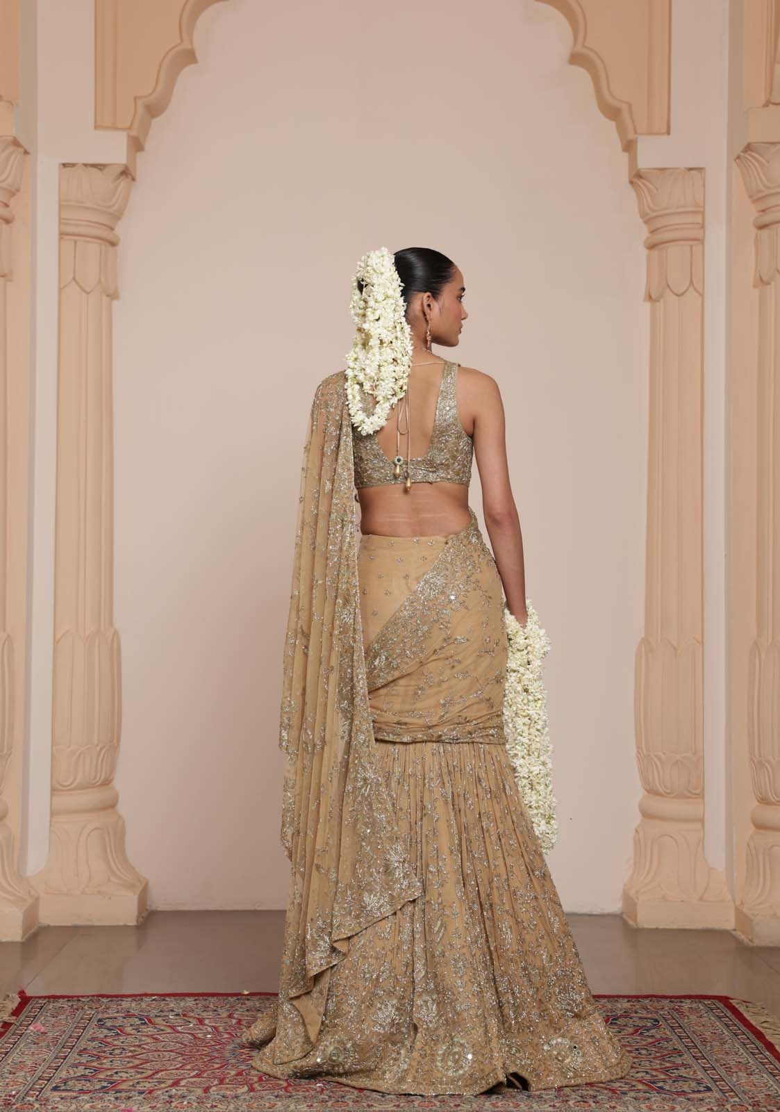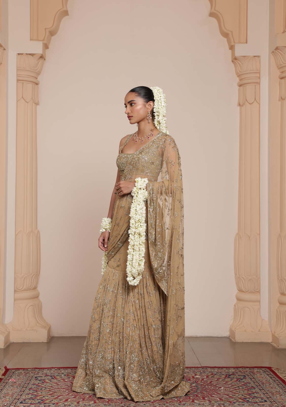 A stunning beige and gold sari set featuring delicate net fabric, hand-embroidered mirror, cutdana, and sequin detailing, perfect for weddings and festive occasions
