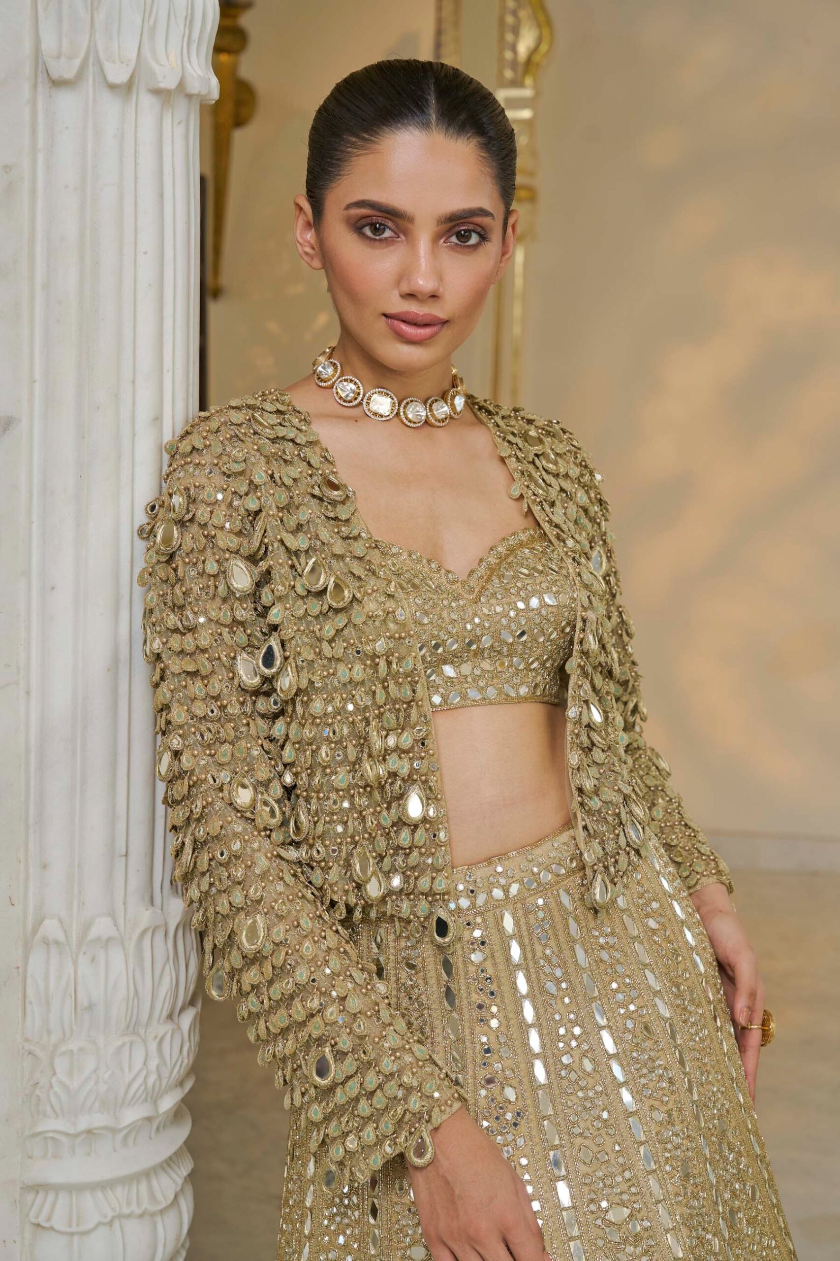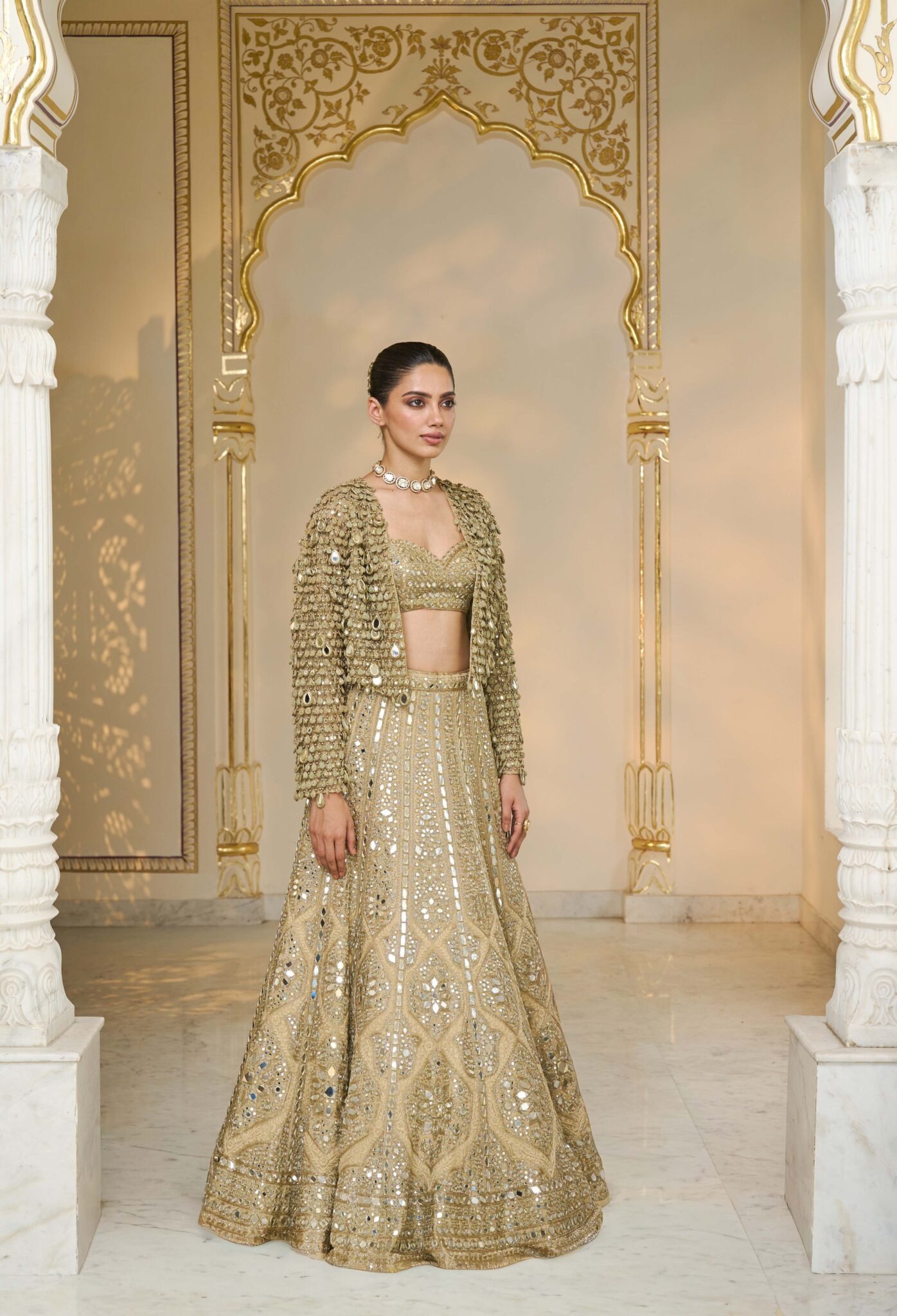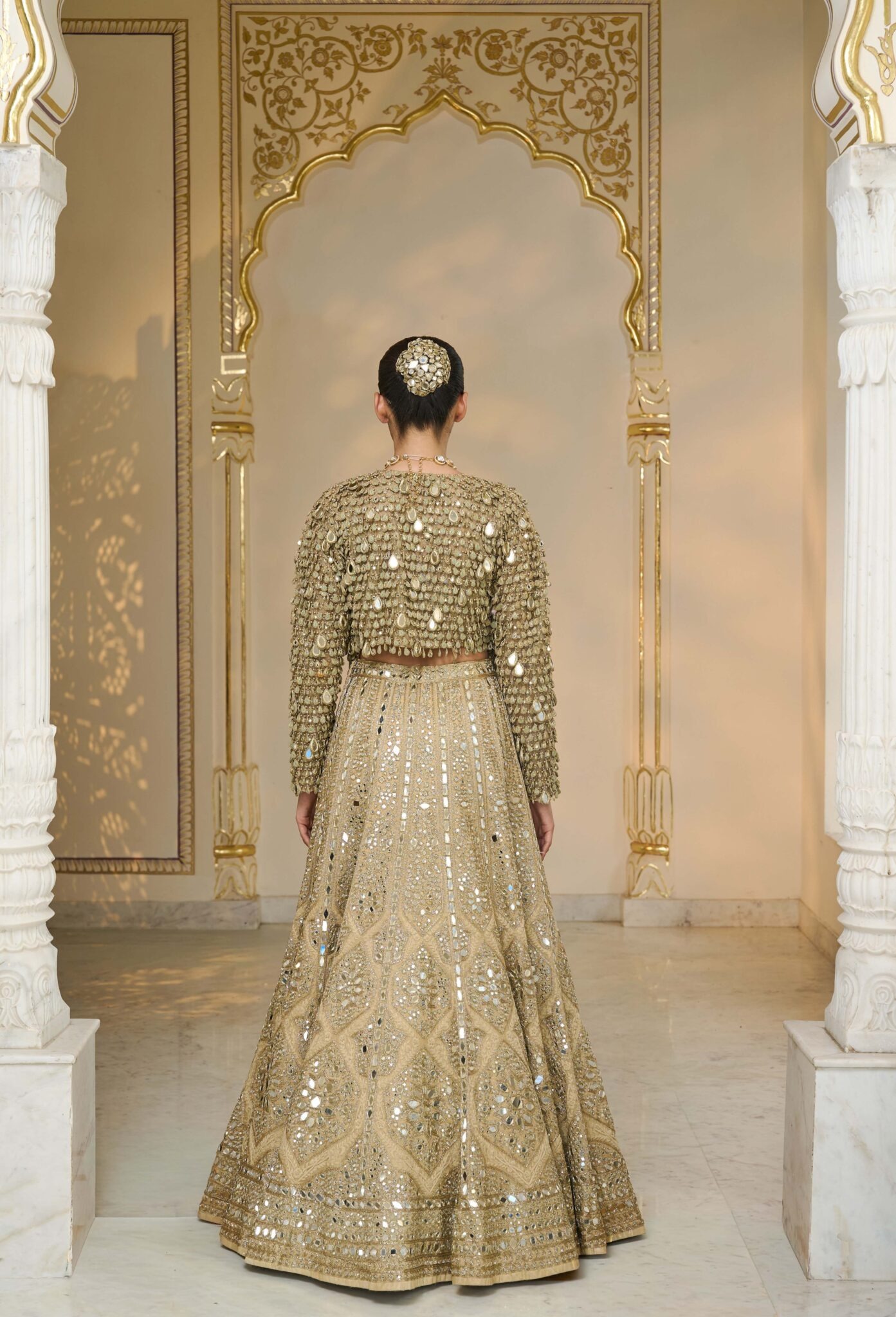 This beige-gold lehenga is crafted from premium tissue fabric, designed to provide a graceful fall and structured elegance. Hand-embroidered mirror, cutdana, and kasab detailing is thoughtfully placed to create a harmonious and luxurious visual appeal, perfect for weddings and festive occasions.