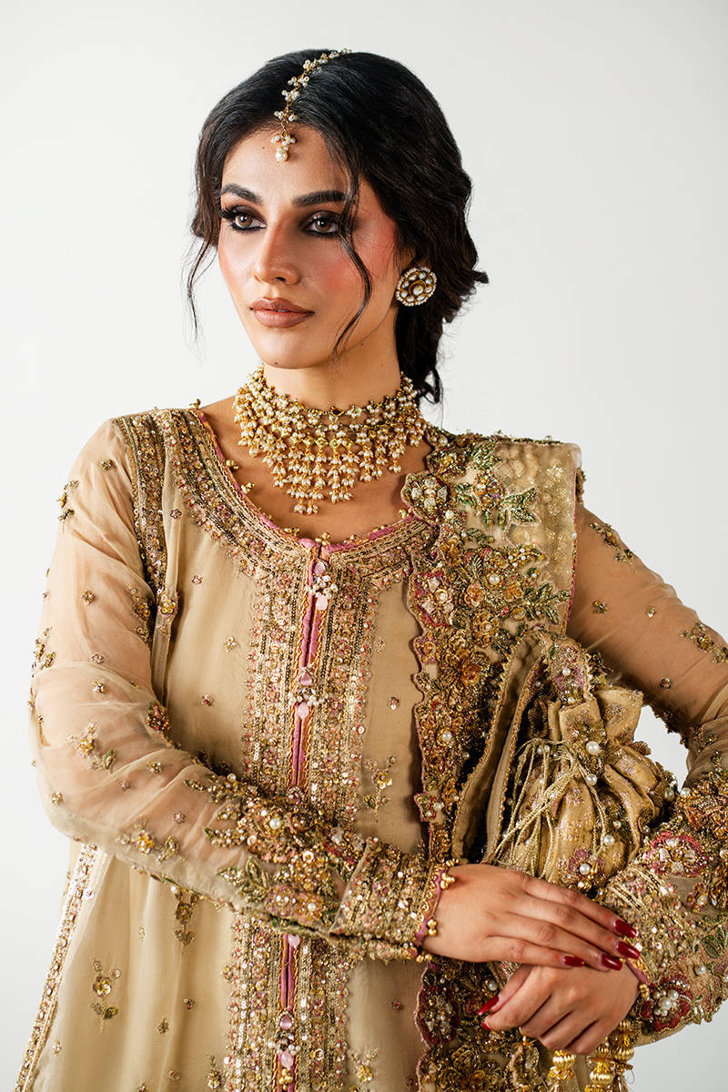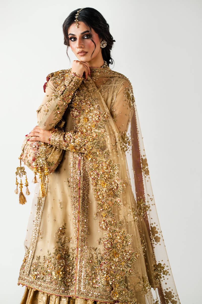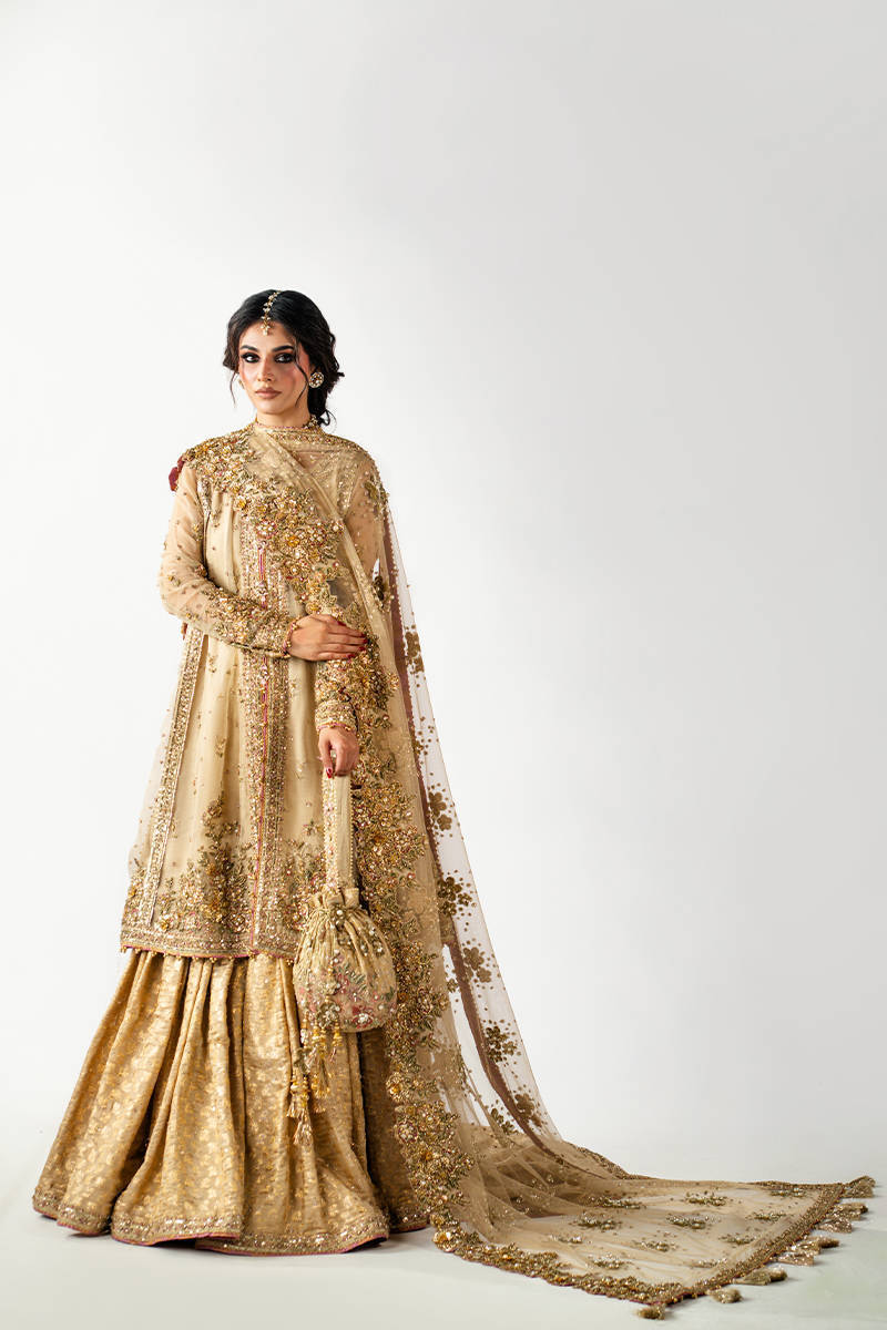 Paired with the gown is a jamawar tailed gharara that adds heritage richness to the ensemble. The gharara is tailored with a graceful spread and structured tail, offering a classic silhouette that balances the modern cut of the gown.