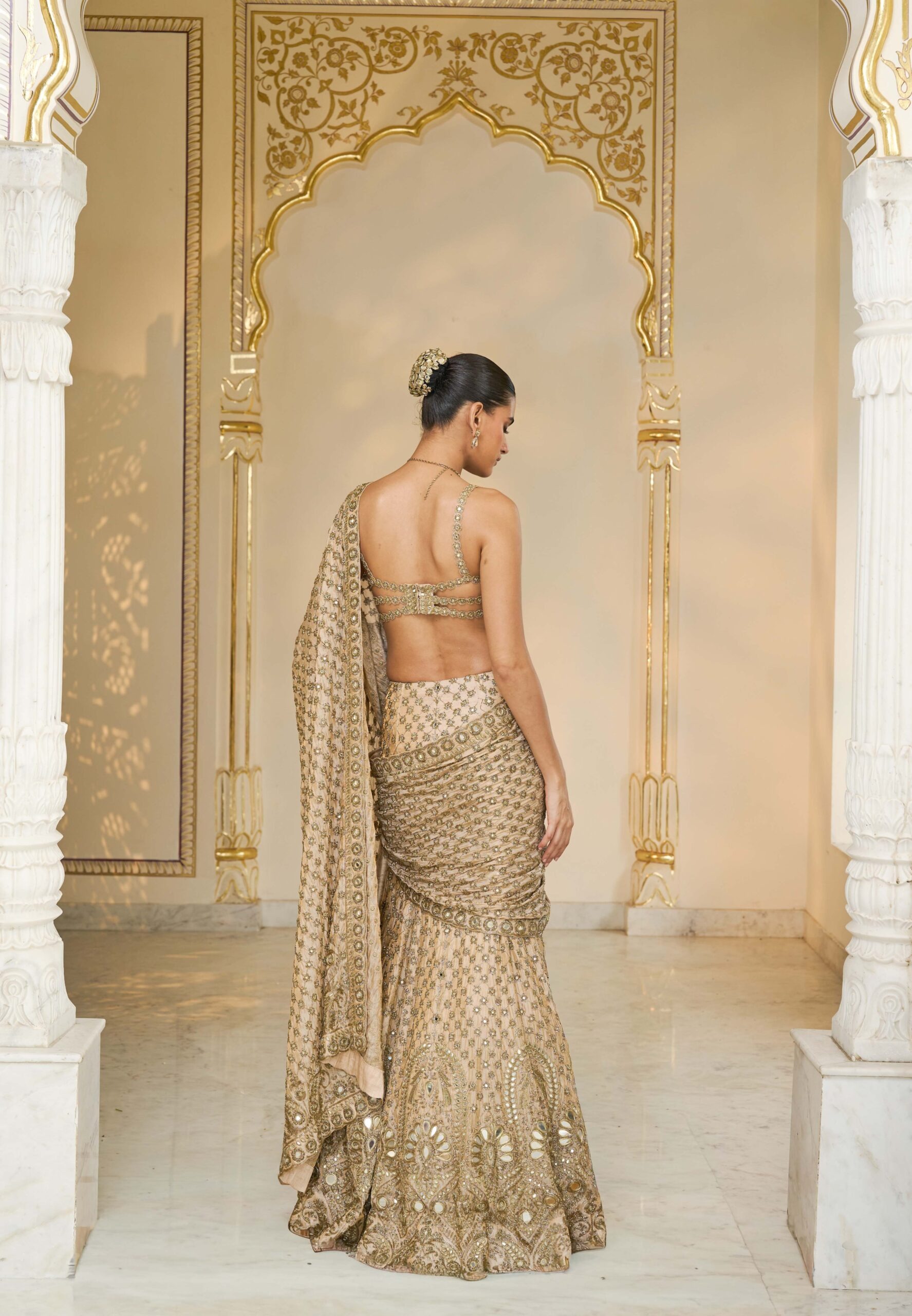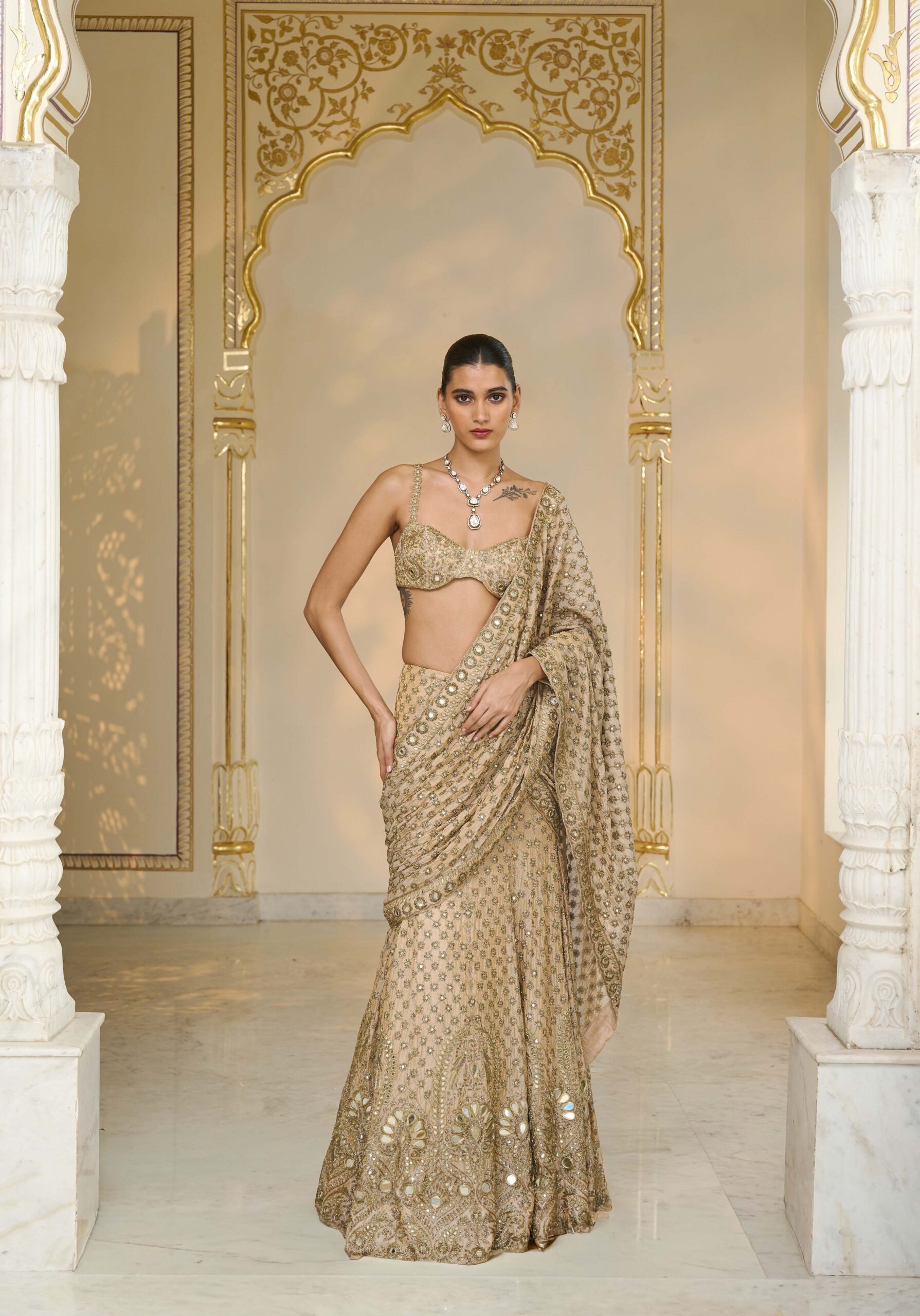 The lehenga is crafted from premium gold tissue fabric, featuring intricate hand-applied mirror, cutdana, and kasab embroidery. The embellishments are arranged to create a balanced and visually captivating effect, giving the skirt a luxurious and ceremonial appeal.