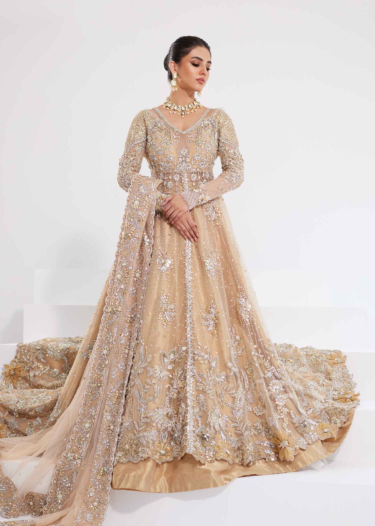 The peshwas is crafted from soft net in a rich golden-beige tone, brought to life with mixed metallic threadwork that glimmers beautifully from every angle. Crystals and pearls are scattered across the bodice and sleeves, forming delicate constellations that enhance the gown’s romantic shape. The fitted upper silhouette flows seamlessly into the fuller flare, with a structured inner lining that keeps the form elegant and comfortable. Every edge is finished with care to maintain a refined, polished look.