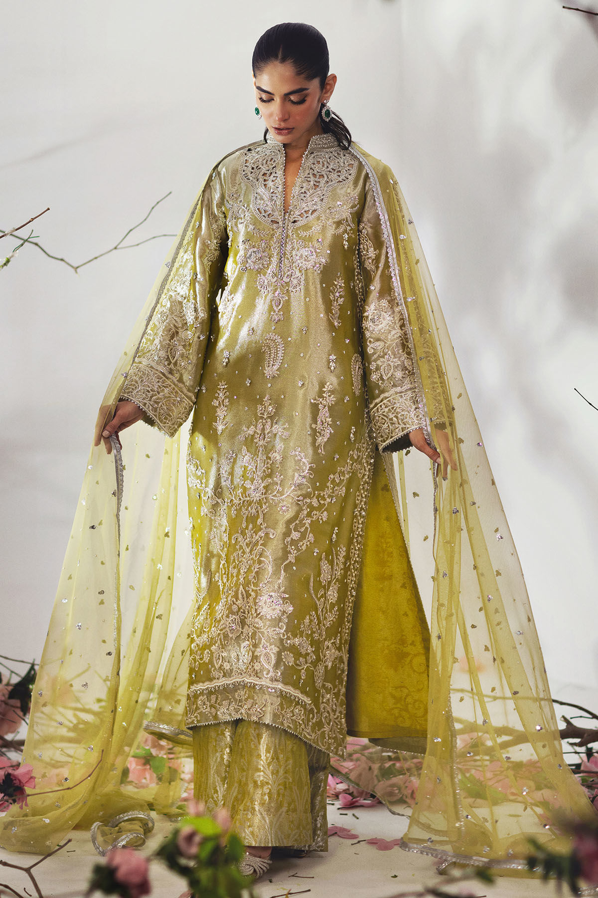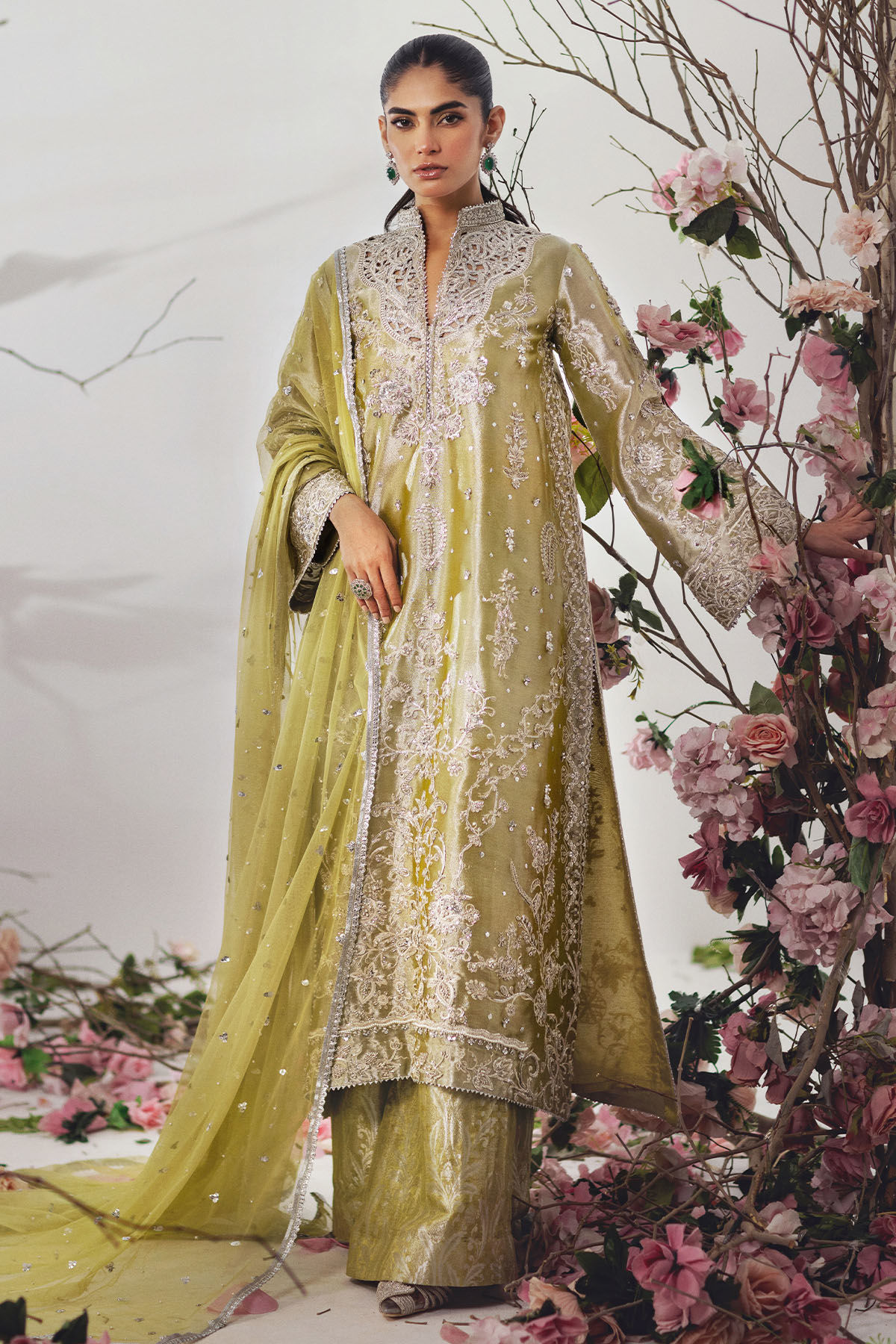 A luminous olive-gold traditional outfit enriched with intricate silver-gold embroidery, paired with a delicately embellished dupatta for an effortlessly regal statement.