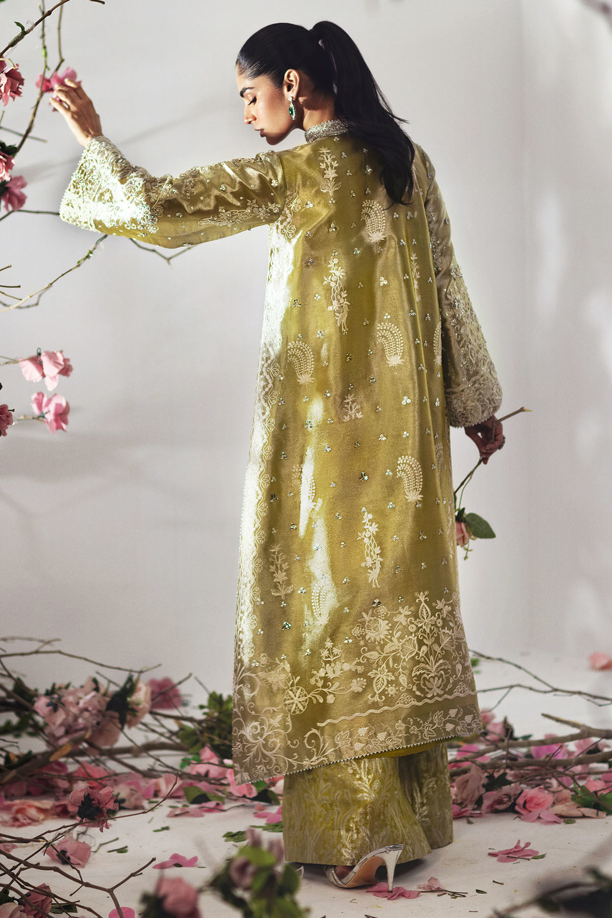The bottom is tailored in a coordinating olive-gold katan silk, offering a straight and polished silhouette that complements the intricacy of the top. Subtle woven patterns and a soft sheen elevate its appearance, while the clean finish keeps the overall look refined and balanced. The design allows ease of movement while preserving a sophisticated aesthetic.