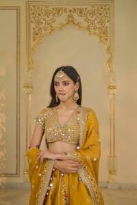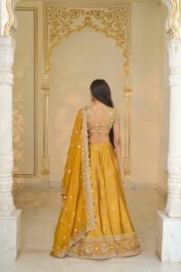 The blouse is tailored from premium banarasi fabric featuring a luxurious yellow and rose-gold color blend. Hand-embroidered detailing including reflective elements and fine thread artistry adds depth and brilliance, creating a refined bridal statement. The structured finish ensures a flattering, polished silhouette for formal celebrations.