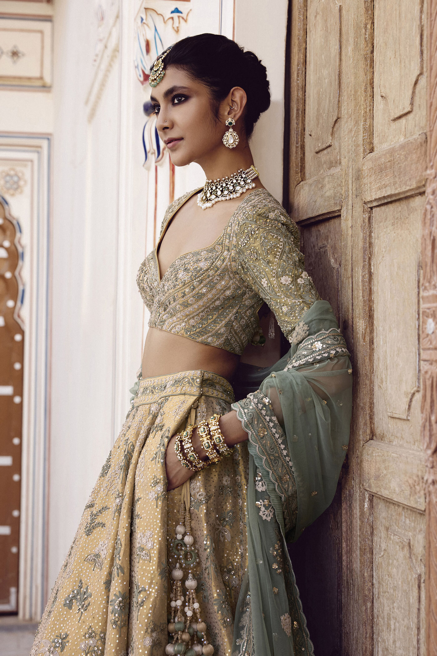 The ensemble is paired with an ethereal dupatta crafted from sheer sage green net. It features a delicate transparency that adds a soft, contrasting layer to the bold golden palette of the lehenga. The edges are finished with a fine tilla binding and a continuous row of shimmering micro-motifs, preserving a graceful, lightweight drape that can be elegantly styled over the shoulder or head.