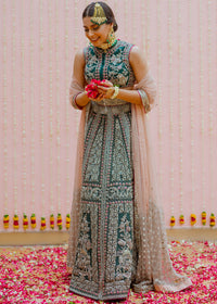While the ensemble does not include a separate dupatta, the coordinated blouse and lehenga combination creates a complete, striking look for bridal or festive events.