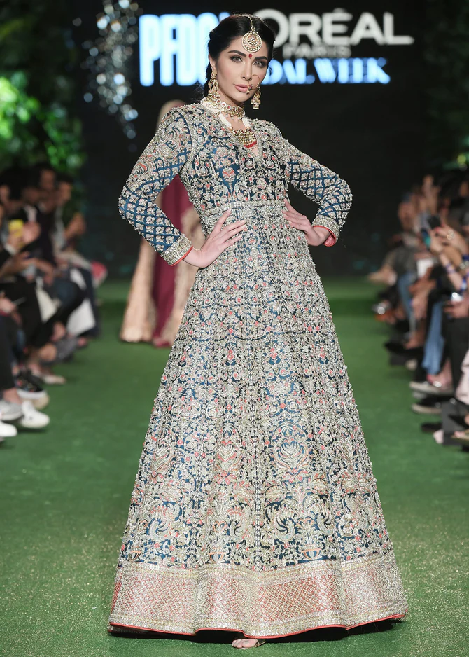 The top of this exquisite Alina Ashfaq bridal dress is designed as a flowing grey multi-layered gown, crafted from premium fabrics to provide a luxurious feel and graceful silhouette. The front, back, and sleeves are embellished with intricate hand embroidery, sequins, and delicate motifs, enhancing the gown’s regal appearance. Its design reflects contemporary bridal fashion, maintaining elegance while showcasing masterful craftsmanship.