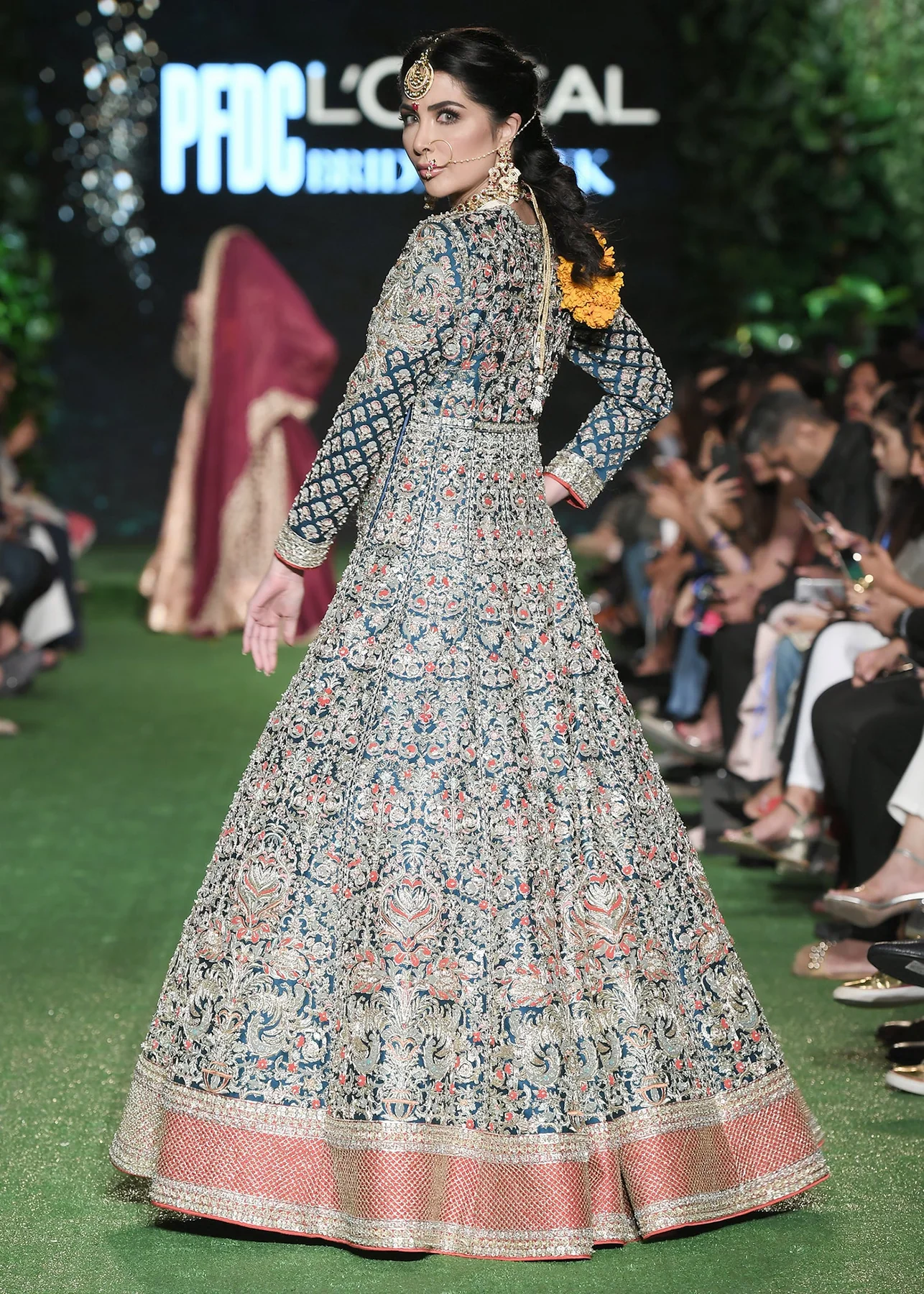 Completing the ensemble is a delicate pink net dupatta that adds a soft, romantic contrast to the grey gown. Its edges are meticulously adorned with hand-embroidered floral motifs, sequins, and subtle embellishments, perfectly complementing the gown. The dupatta flows gracefully, lending a charming finishing touch to the bridal attire.