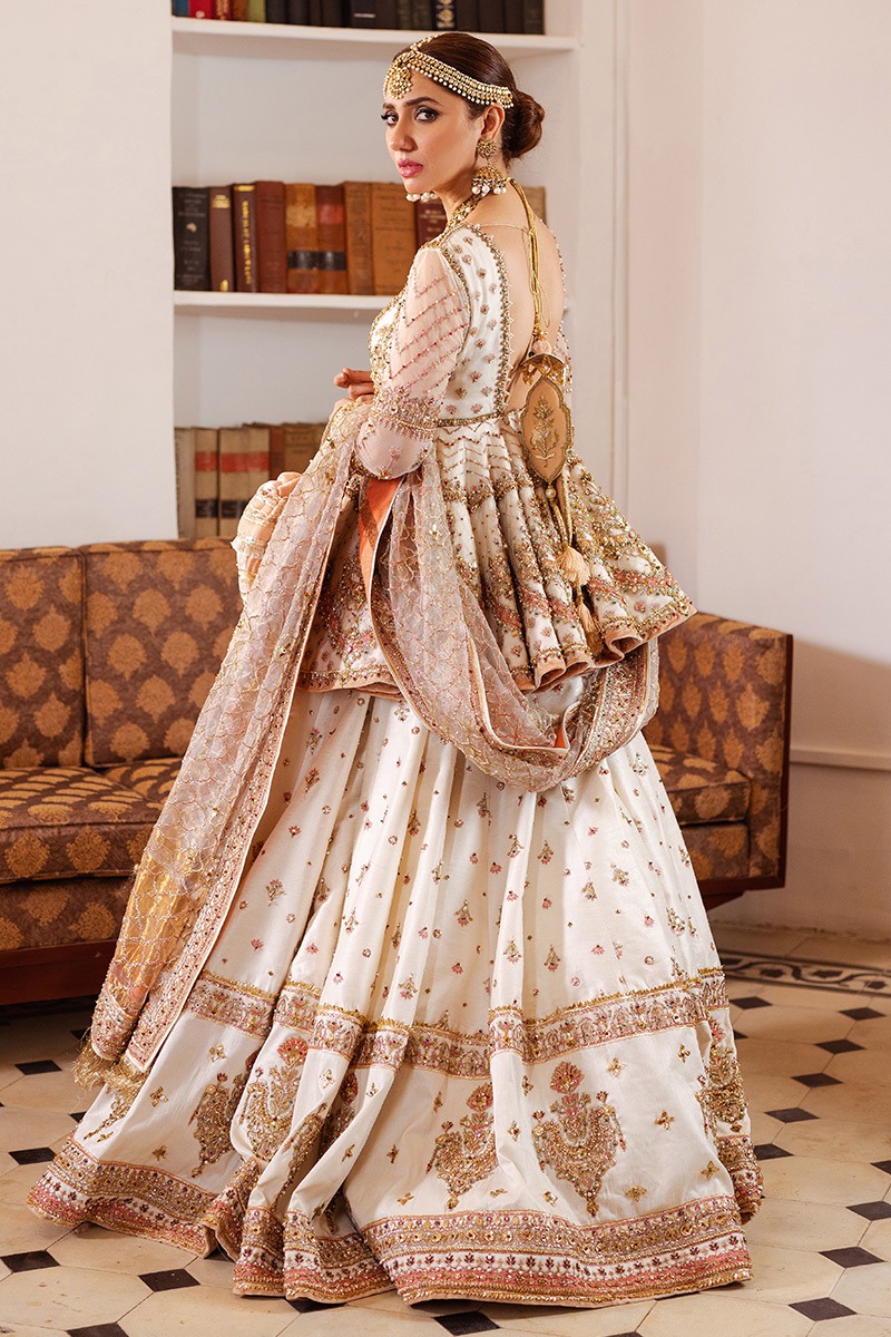 The lehnga is crafted from Indian silk and adorned with a dense spray of signature floral bootis. The rich texture and flowing volume bring balance to the structured peplum, resulting in a graceful and harmonious silhouette.