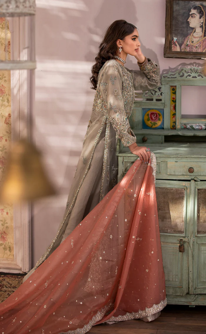 The ensemble is completed with a soft salmon peach organza dupatta that offers a striking yet graceful contrast to the steel grey base. It is adorned with delicate motif sprays and intricately detailed borders, finished with elegant tassels that add a touch of artisanal finesse.