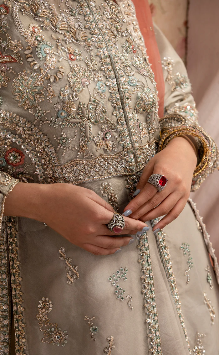 The jacket is tailored in luxurious steel grey organza, designed with a graceful elongated silhouette that exudes sophistication. It features a delicate tropical-inspired pattern, enriched with intricate hand embroidery executed using premium cora, dabka, pearls, and fine detailing. Subtle tassel accents add movement and charm, elevating the jacket into a statement piece suitable for formal and celebratory occasions.