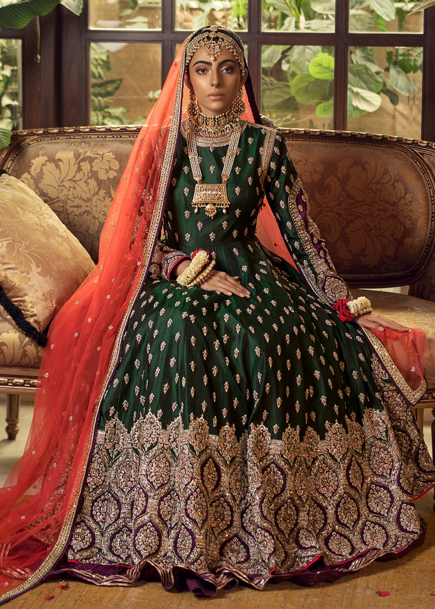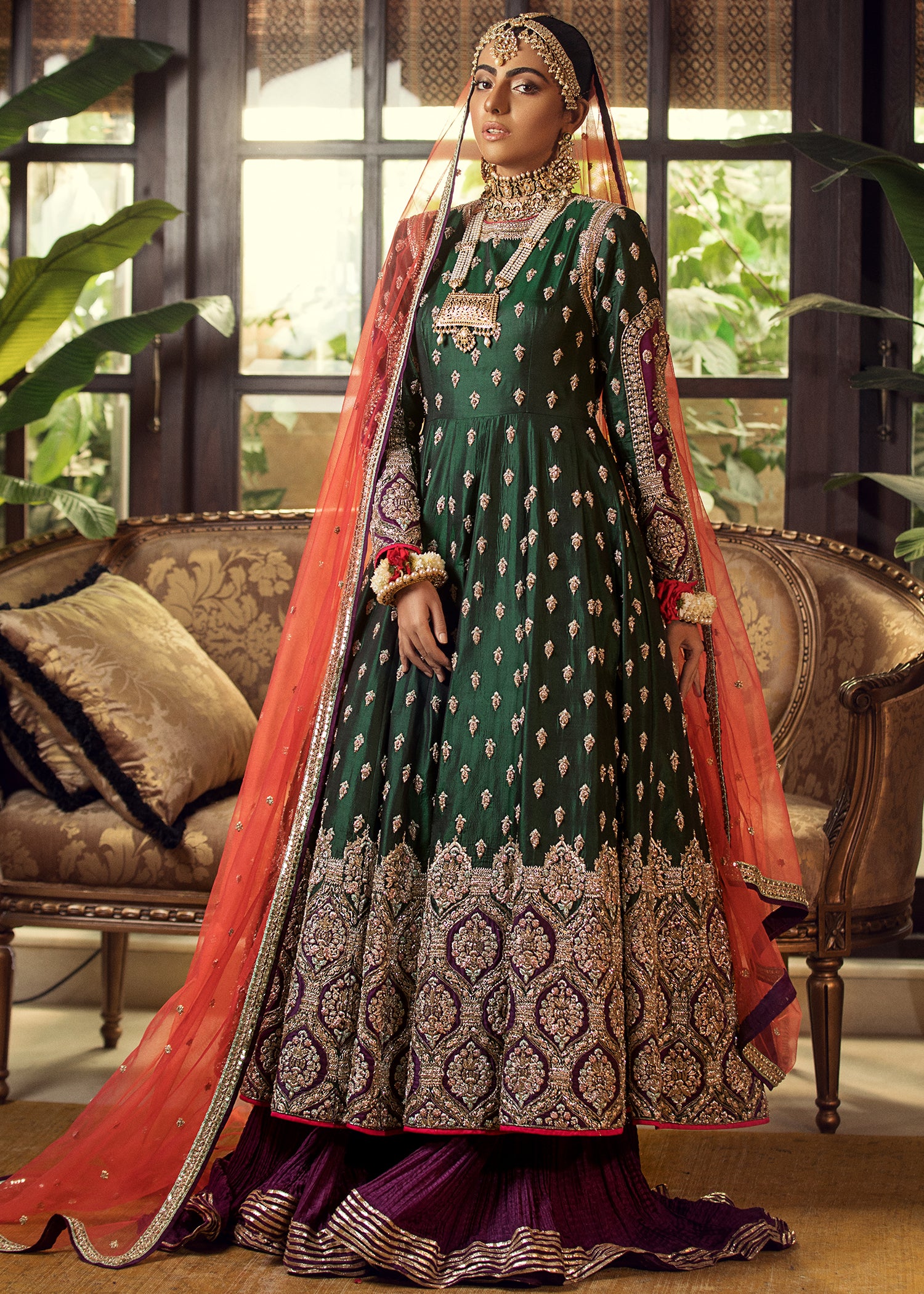The accompanying dupatta is crafted from sheer, lightweight fabric and bordered with elegant embroidery. A subtle spray of motifs brings a touch of radiance across the surface. Its soft drape pairs seamlessly with the maxi, completing the ensemble with a graceful, formal presence.