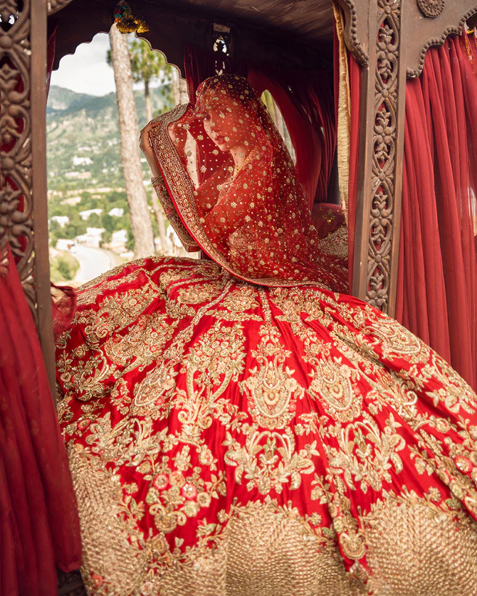 The red blouse is a masterpiece of craftsmanship, adorned with intricate golden embroidery including kora, dabka, tilla, and zardozi. Designed with an illusion neckline and full sleeves, the choli radiates sophistication and charm, making it a perfect choice for your reception day.