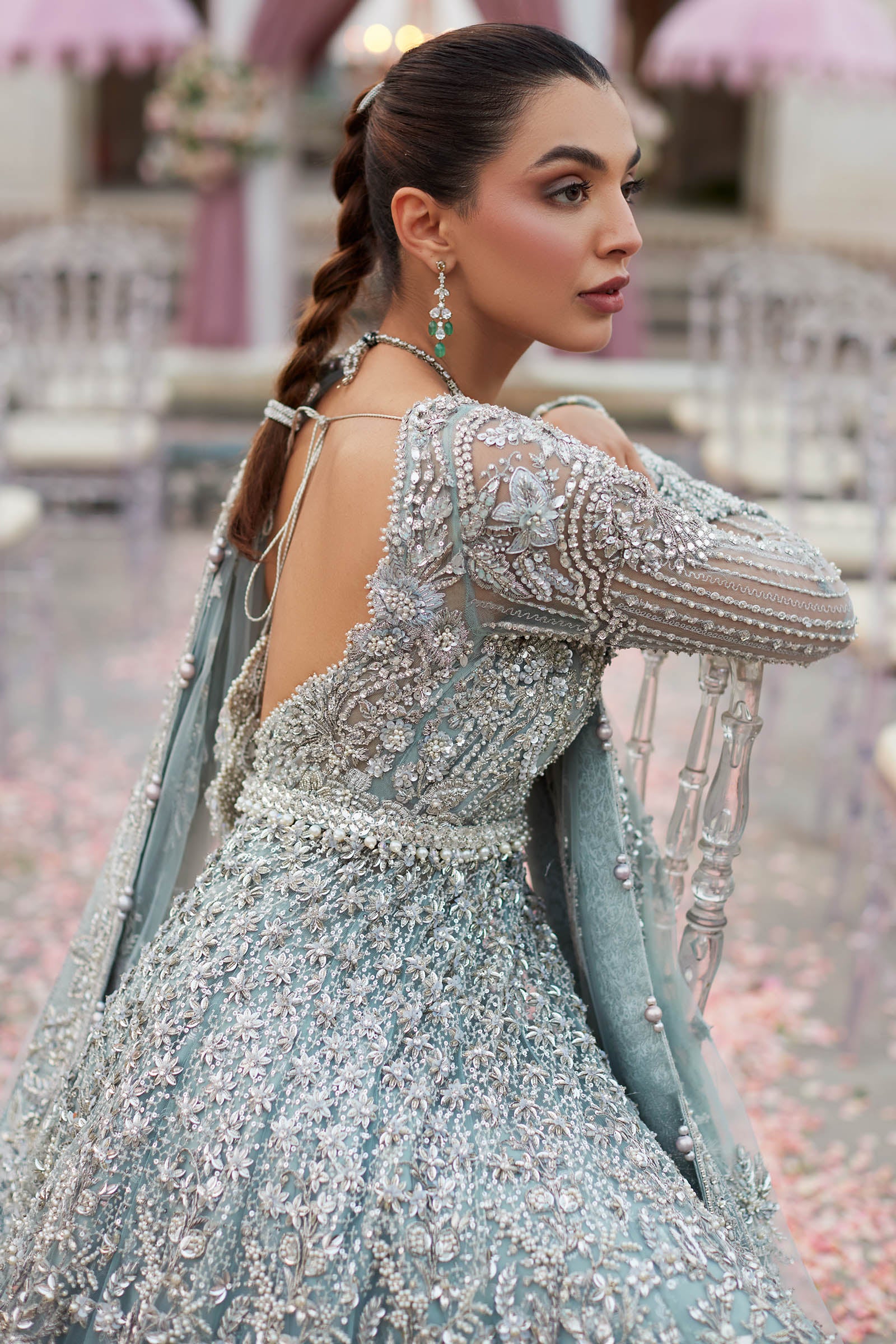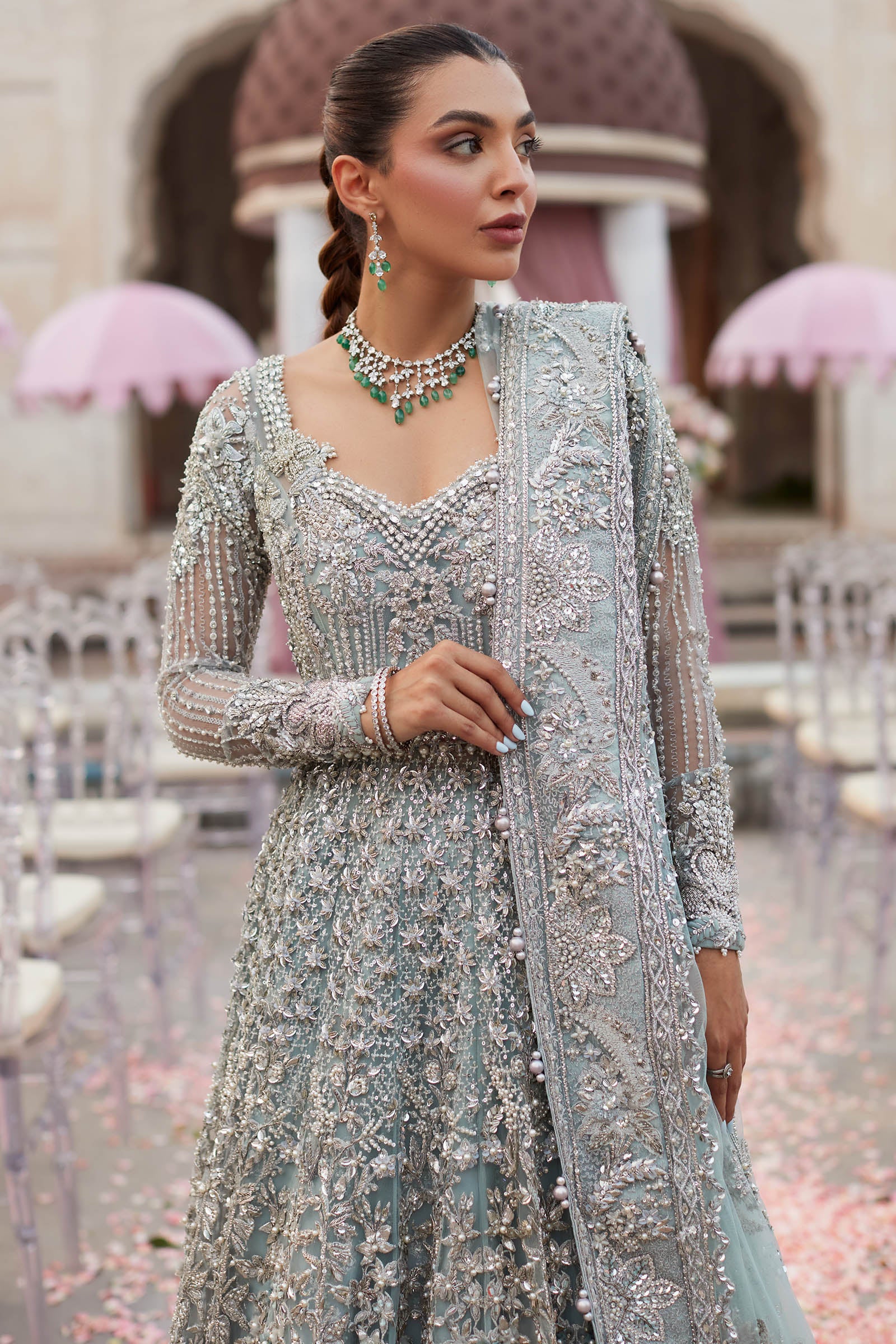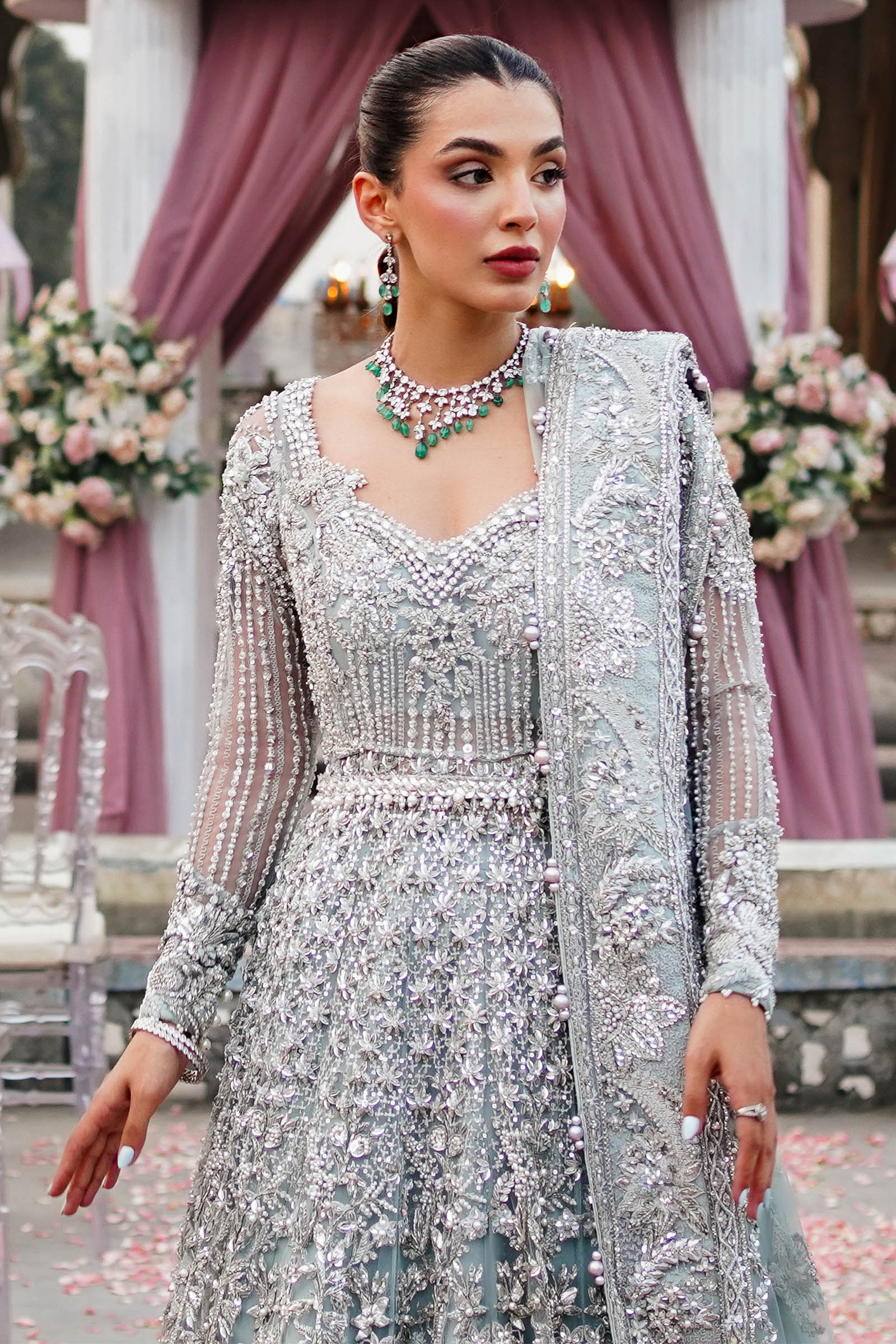 Ethereal and regal, Zaha is an ice-blue bridal maxi adorned with intricate silver-chrome floral motifs, tilla, gotta, kora dabka, and resham work, paired with a delicately hand-embellished zari net dupatta.