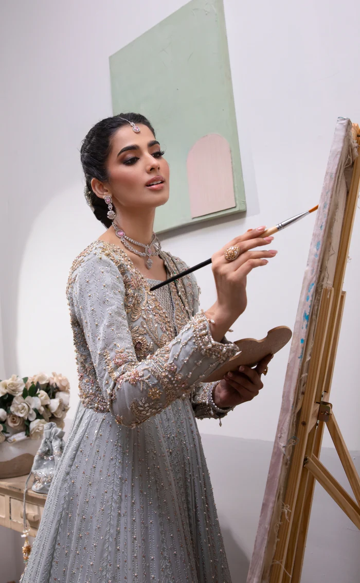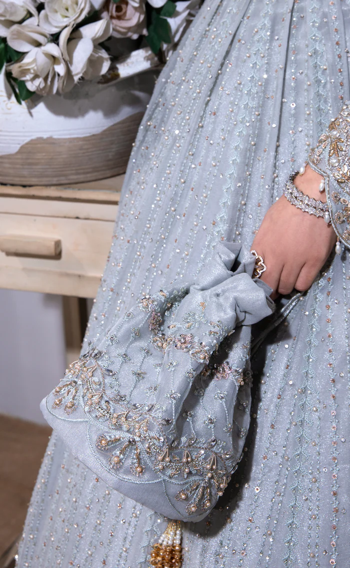 A soothing ice-blue tone that enhances the delicacy of the chiffon fabric and highlights the handcrafted embroidery.