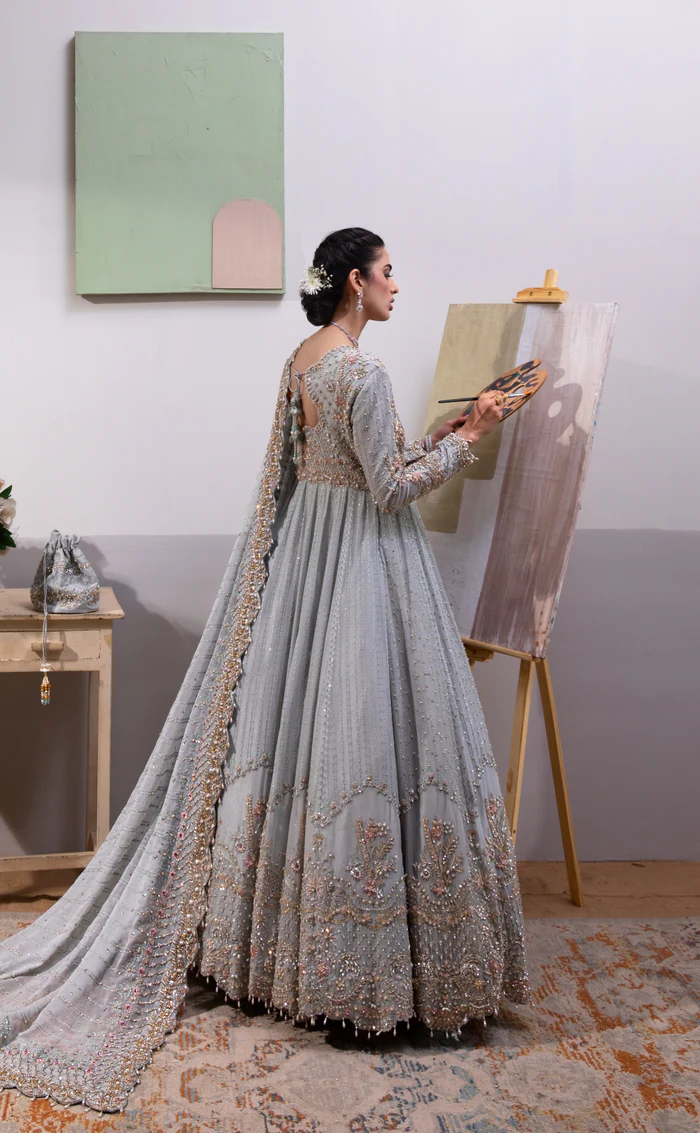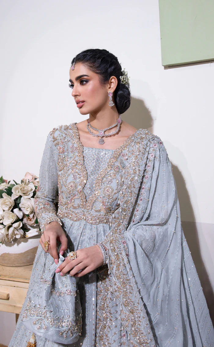 A graceful chiffon maxi in a serene ice-blue hue, beautifully handcrafted with intricate embroidery and paired with a delicately bordered chiffon dupatta for an effortlessly elegant look.