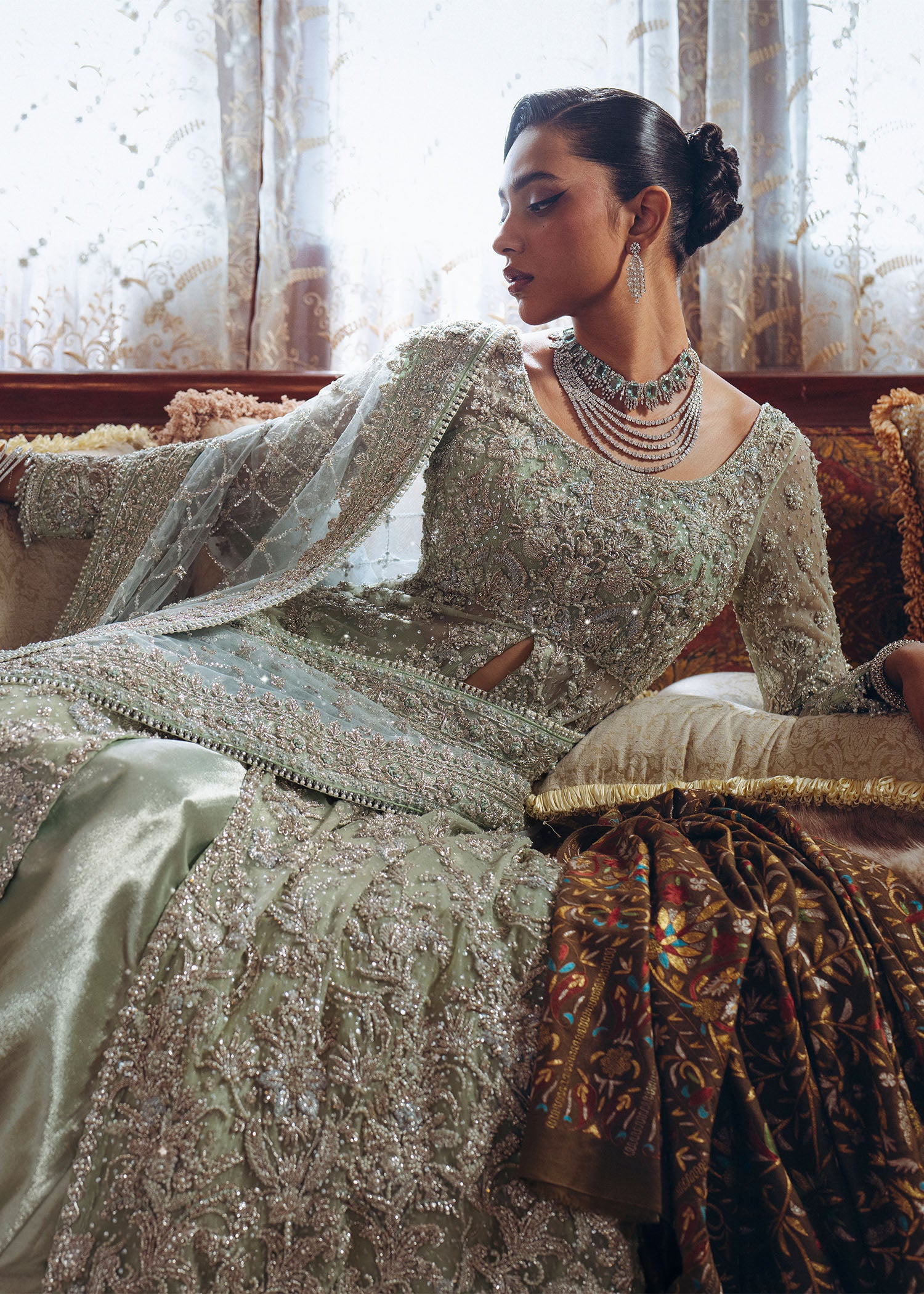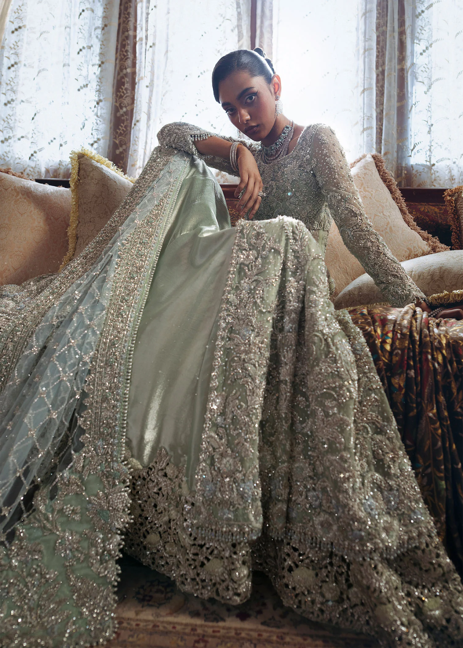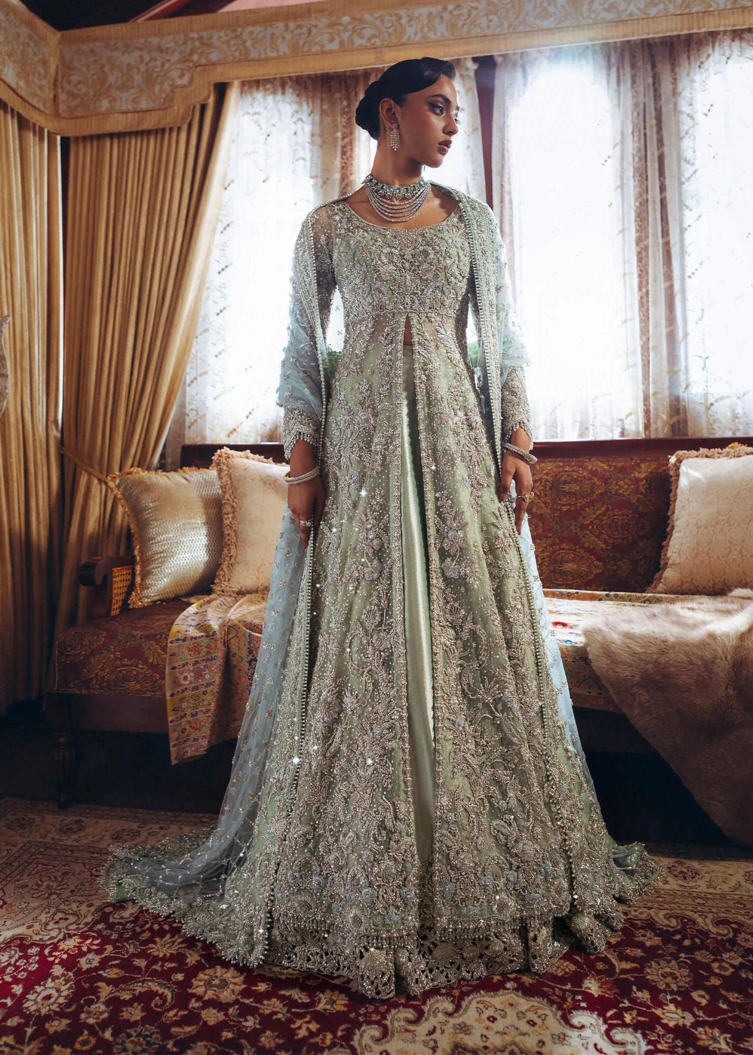 Entirely handcrafted using dabka, naqshi, pearls, sequins, and fine thread embroidery. Slight variations may be present, celebrating the authenticity and artistry of hand embellishment.
