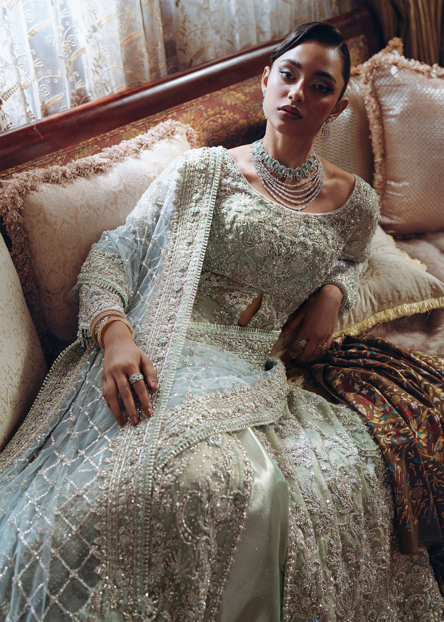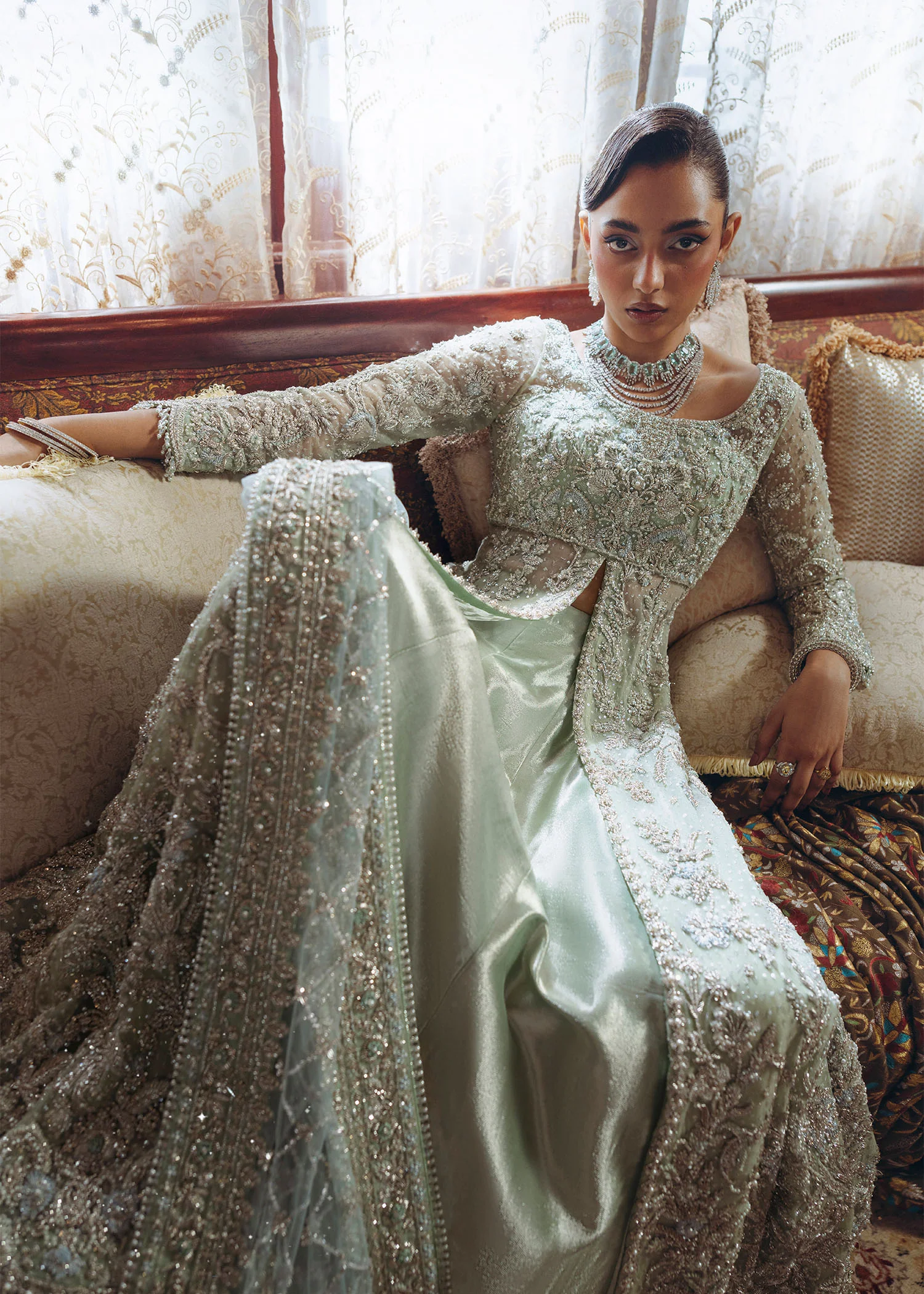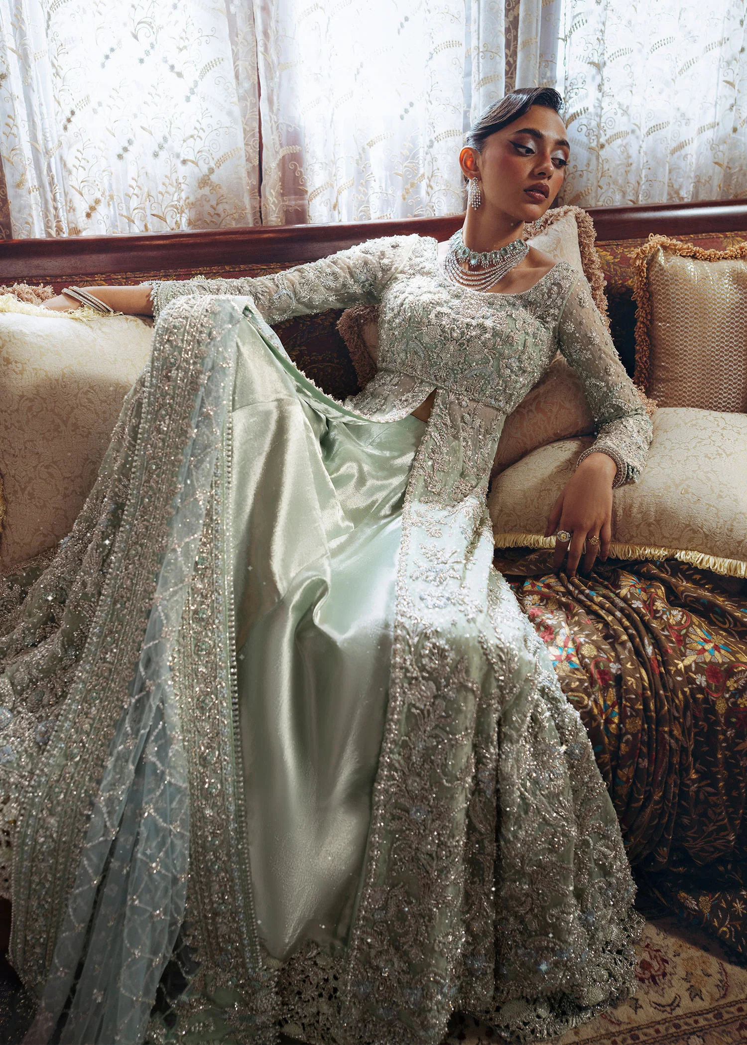 This set is a graceful fusion ensemble in calming ice blue and mint tones, designed to embody elegance and softness through delicate fabrics and refined handcrafted embellishment.