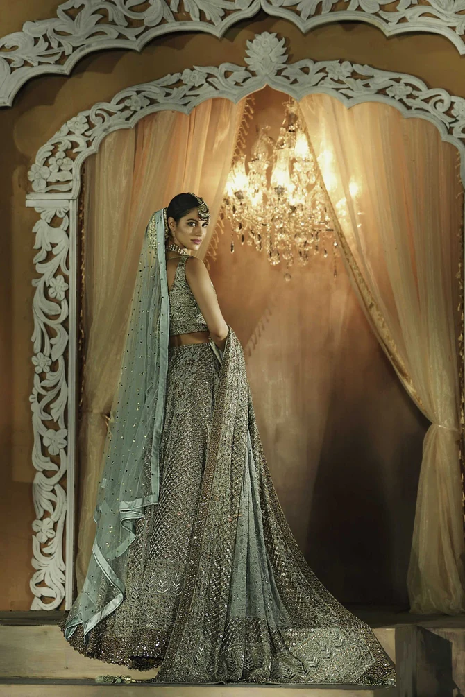 A breathtaking Pakistani bridal lehenga choli in ice grey, exquisitely crafted on chiffon chicken kari and adorned with antique gold embellishments, paired with a grand mukesh dupatta for a regal bridal finish.