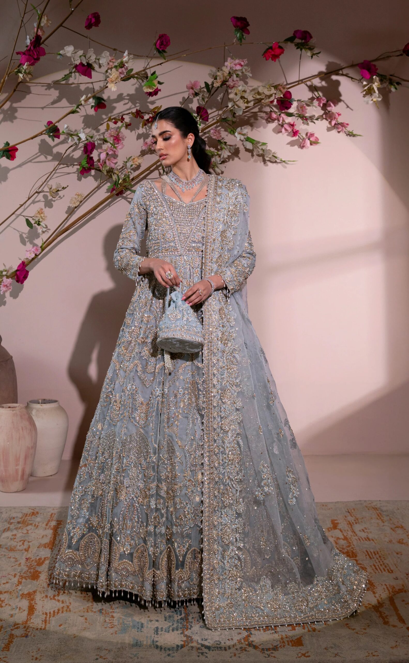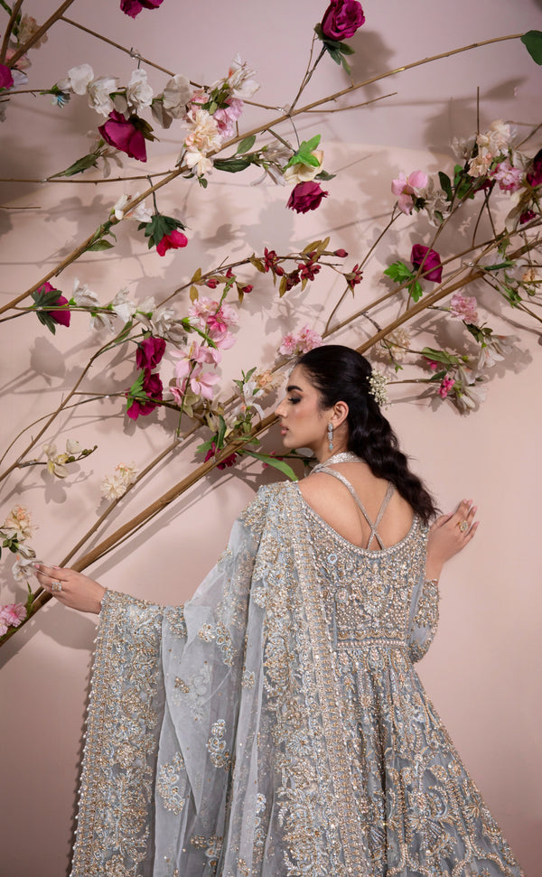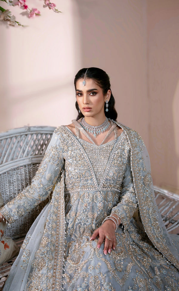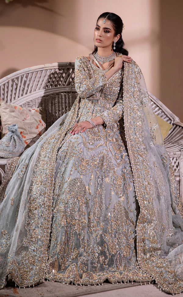 The maxi gown is crafted in a serene ice blue shade using pure organza, designed to flow effortlessly with every movement. Intricate embellishment and delicate beadwork are thoughtfully arranged across the surface, creating a soft shimmer that enhances the gown’s refined appeal. The silhouette is structured to offer volume while maintaining a graceful and elongated fall, making it ideal for bridal occasions.