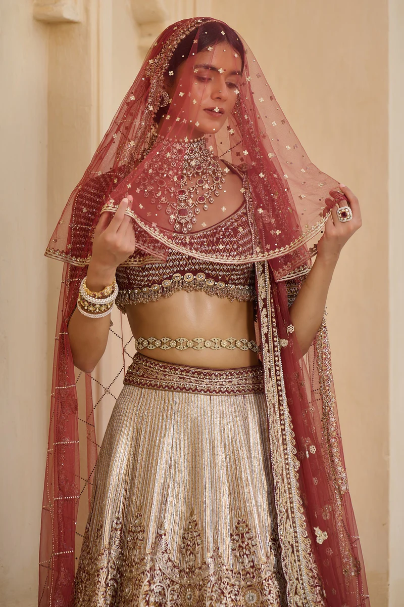 The ensemble is paired with a deep maroon sheer dupatta, bordered with wide, detailed embellishment and golden appliqué that complements the lehenga’s motifs. Intricate motif placements and delicate sequins add a soft radiance throughout the veil. Its edges are finished with a structured lining to preserve a graceful drape while adding stability to the heavily embellished borders.