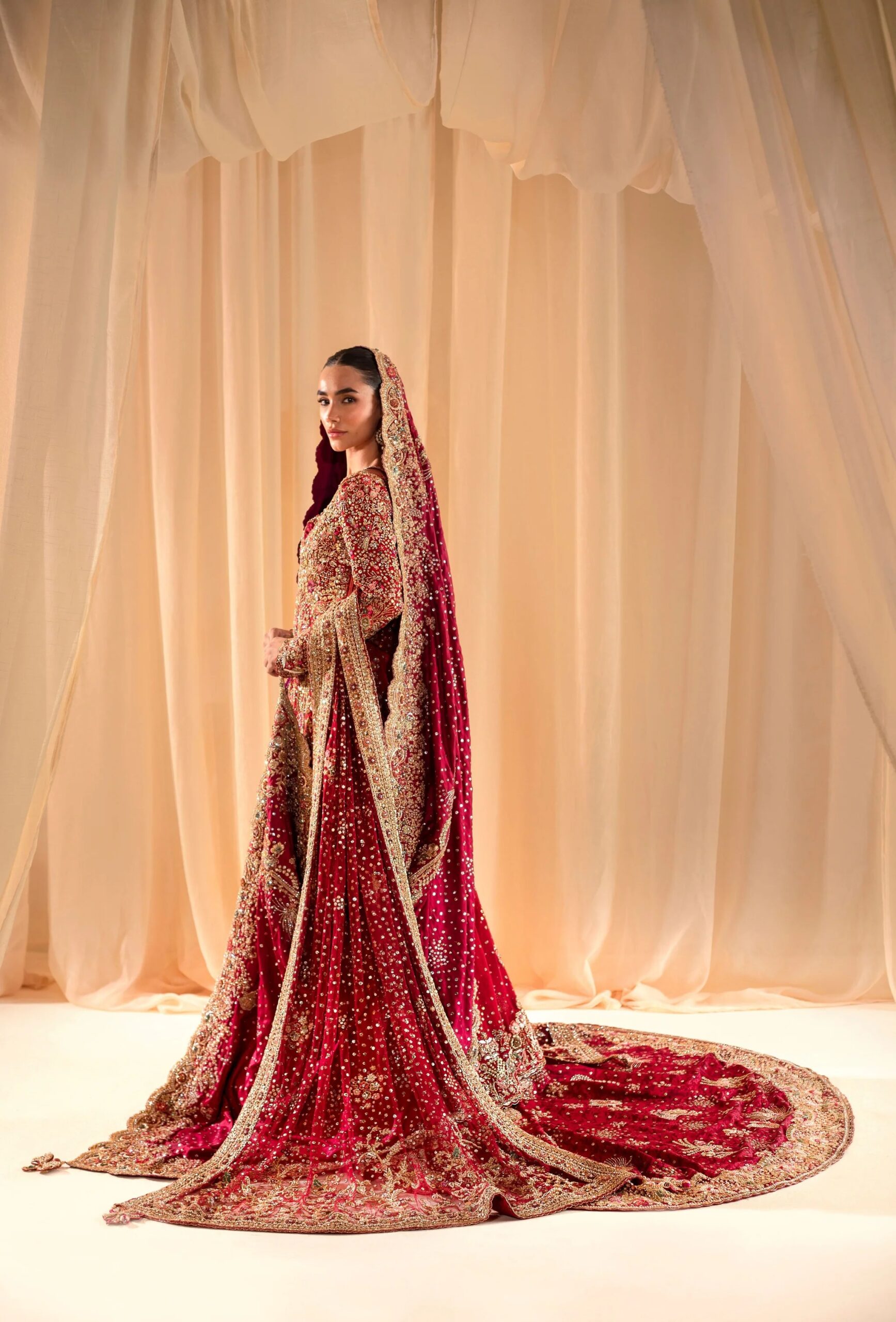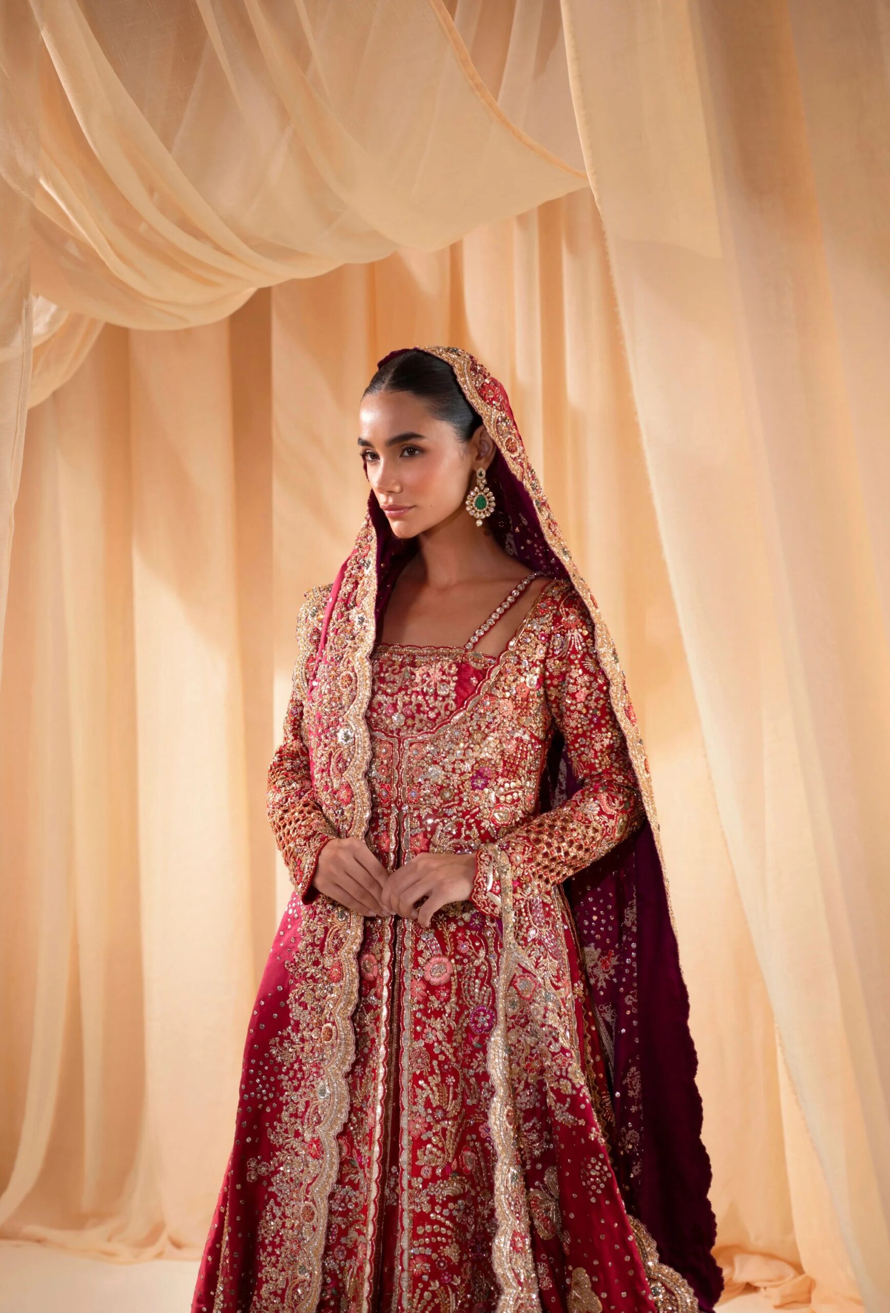A majestic and opulent bridal ensemble featuring an intricately hand-embellished elongated coat in rich maroon katan silk, paired with a matching voluminous lehenga and a delicate chiffon dupatta.