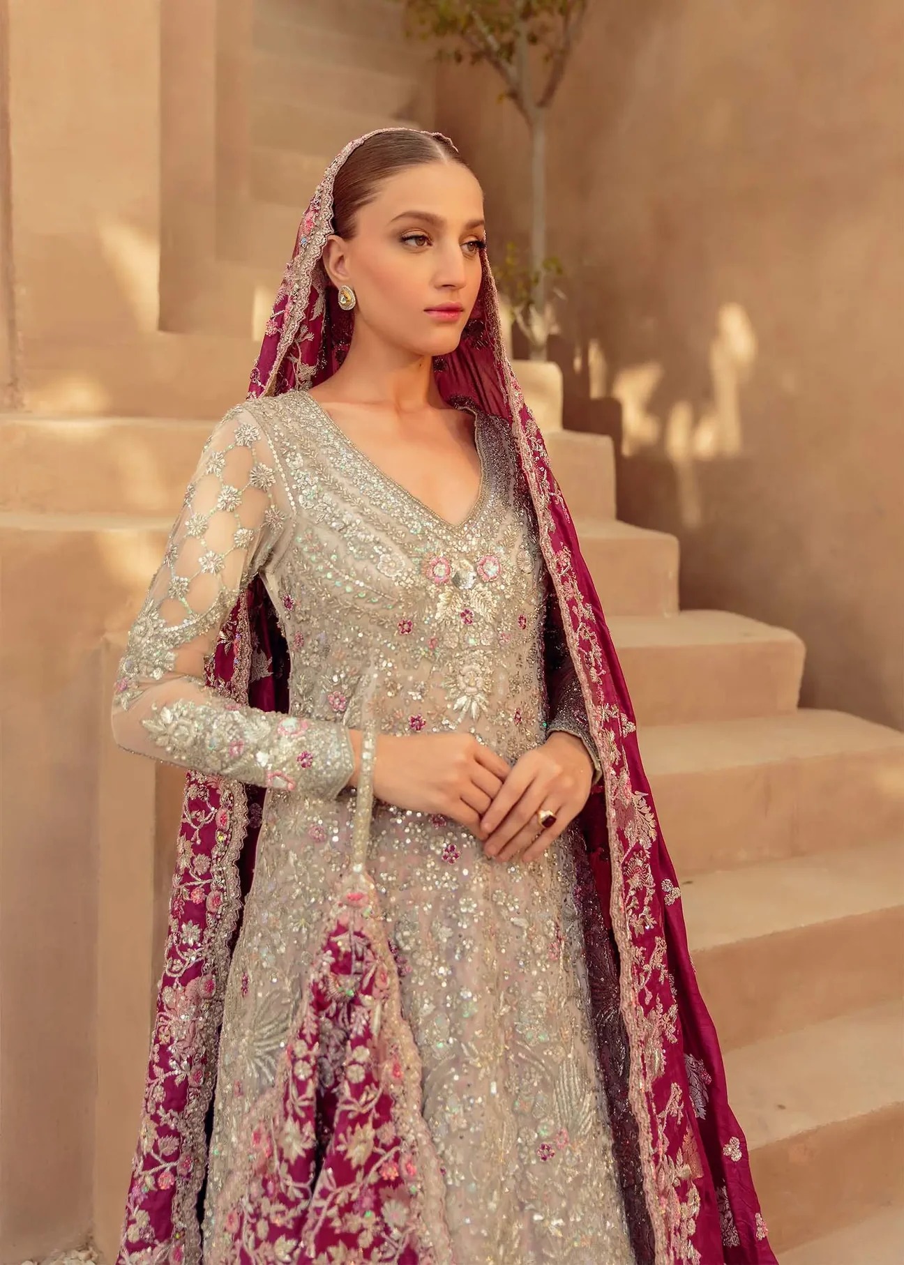 Completely handcrafted using a luxurious mix of sequins, beads, Swarovski crystals, cut-glass touches, kora, naqshi, and tilla embroidery. As this is a bespoke artisanal creation, slight variations may appear, affirming the unique authenticity of the hand-embellishment.