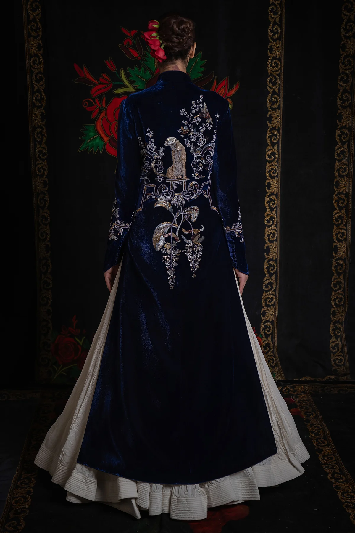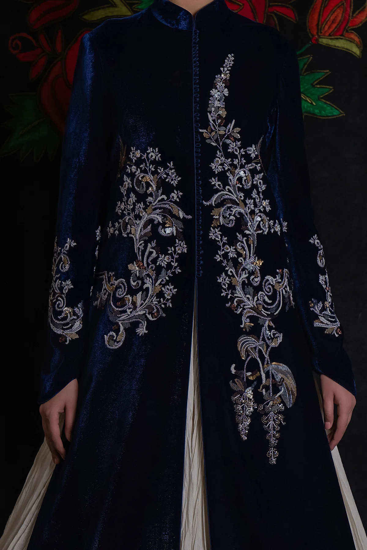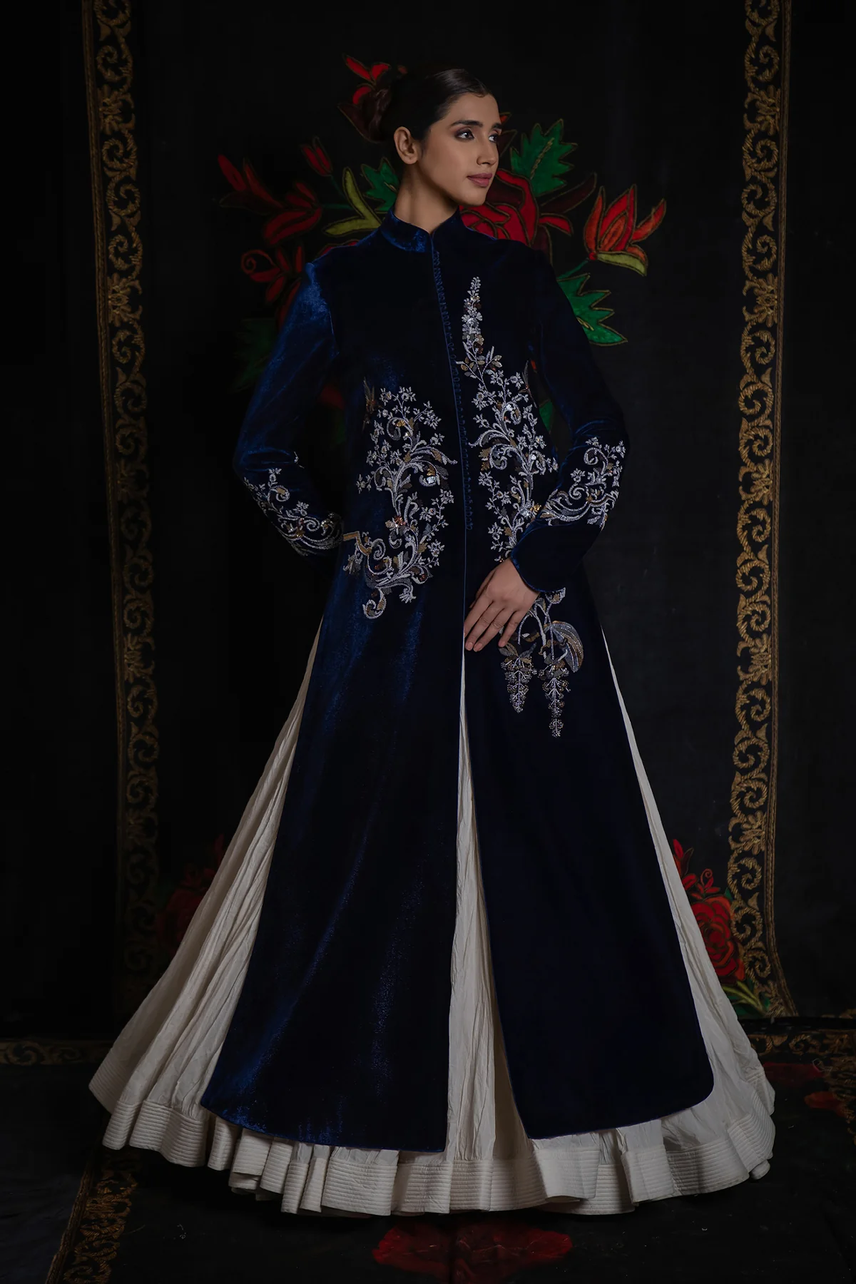 The long jacket is crafted from premium velvet in a deep indigo shade, offering a rich and regal appearance. Intricate embroidery decorates the front panels, neckline, and sleeves, creating a sophisticated interplay of texture and design. The velvety surface enhances the detailing, while the inner finishing ensures comfort and structure. Clean edging and smooth tailoring give the jacket a polished, statement look suitable for festive and formal occasions.