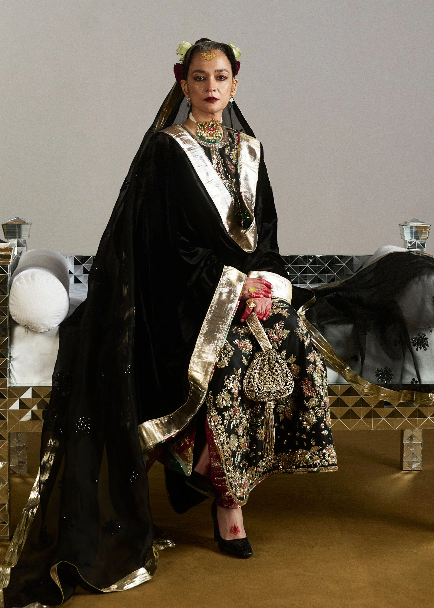The velvet shawl adds a luxurious layer to the outfit, featuring pure mild gold lappa work complemented by vibrant multicolor inner chanderi facings. Its rich texture and detailed finishing elevate the overall look with a regal touch. The self colored black organza dupatta is delicately adorned with shimmering sequins and finished with refined gold lappa edges. Its lightweight and sheer texture adds movement and elegance without overpowering the ensemble.