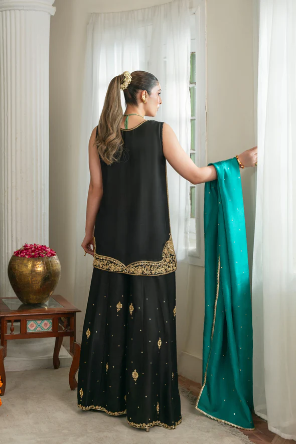 The dupatta is crafted from pure silk in a contrasting emerald green tone, adding a striking visual contrast to the deep black ensemble. It is beautifully adorned with sequins chaath, offering a soft shimmer that enhances the romantic elegance of the look. The fluid drape completes the ensemble with sophistication and grace.