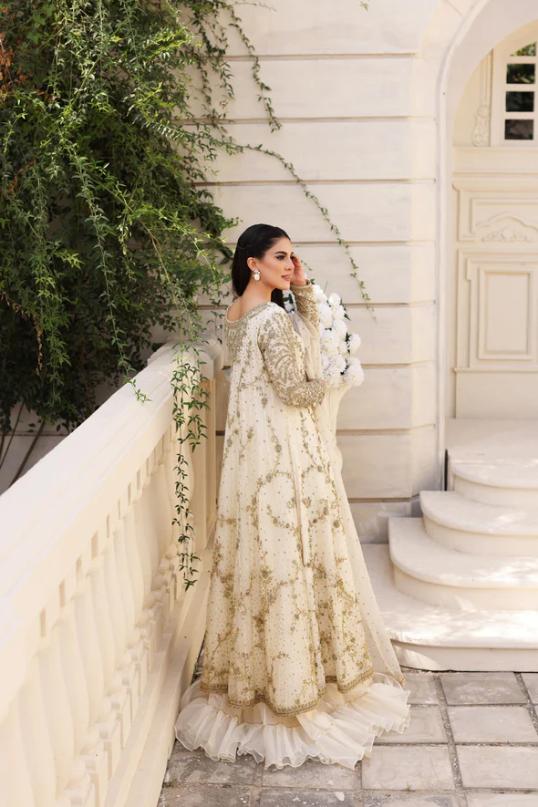 A graceful ivory bridal ensemble crafted from pure handloom cotton net, featuring a flowing kalidaar with rich gold ada work, paired with a layered organza skirt and an intricately detailed bridal shawl for a modern yet timeless bridal look.