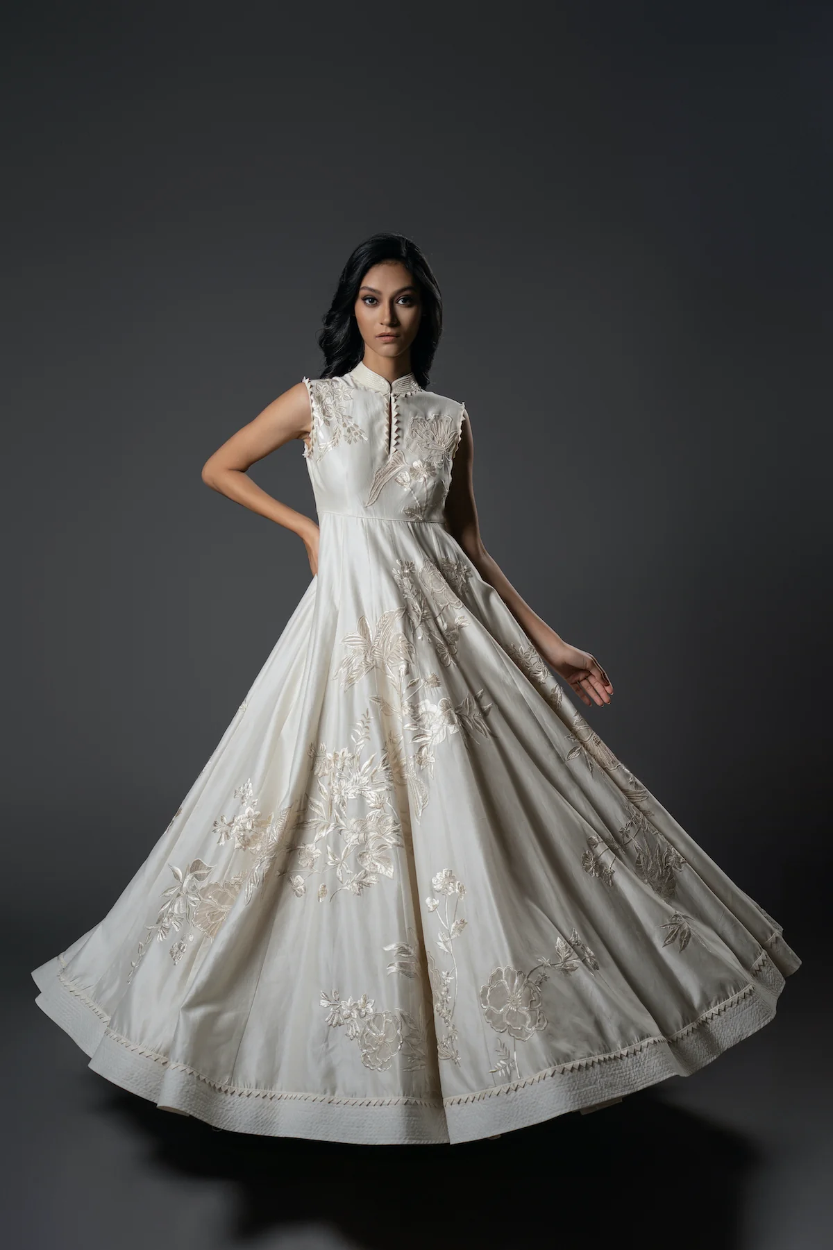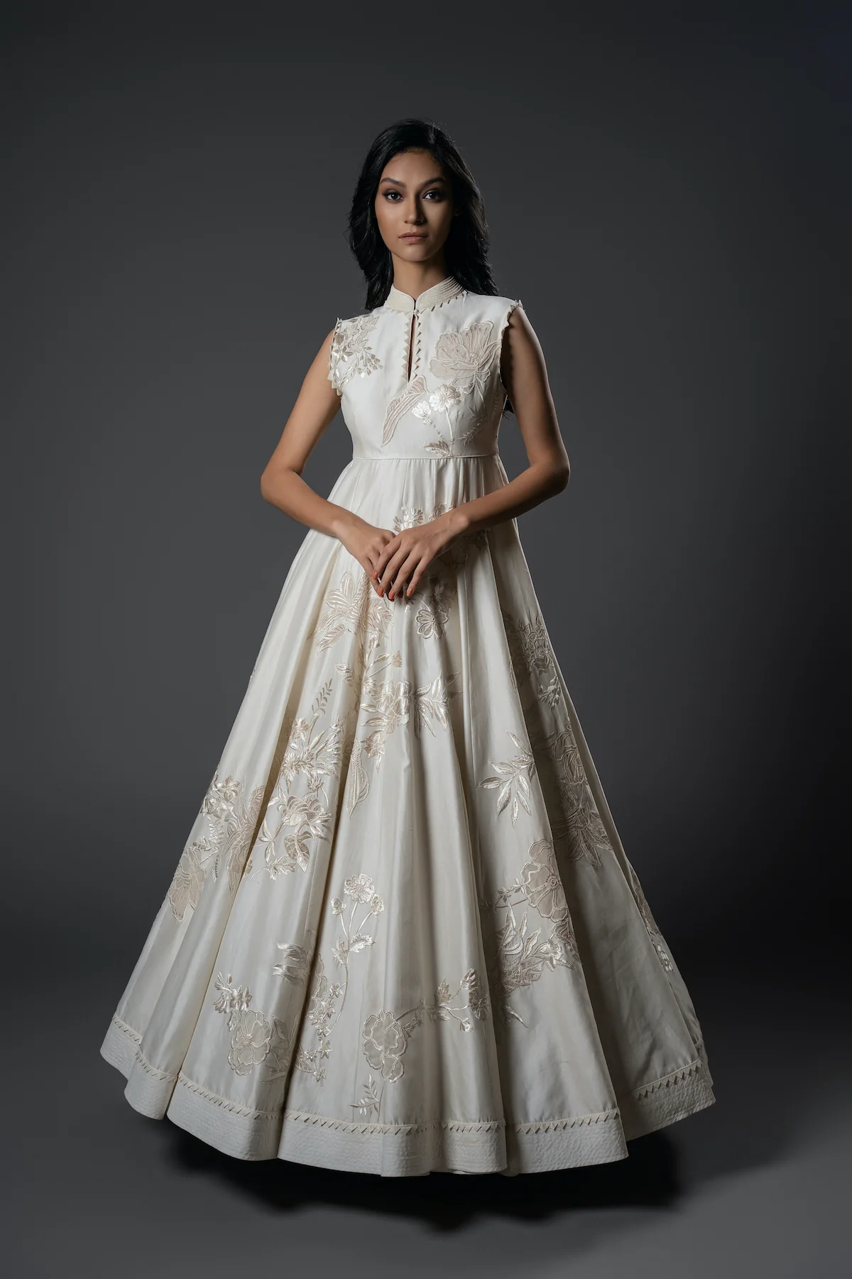 The Anarkali kurta is crafted from refined chanderi silk in a soft ivory shade. It features resham embroidery arranged delicately across the bodice, sleeves, and panels, adding subtle texture and elegance. The silhouette flows gracefully with a structured flare, while the inner lining ensures comfort and ease of movement. The neckline and cuffs are neatly finished, giving the outfit a polished and timeless appeal.