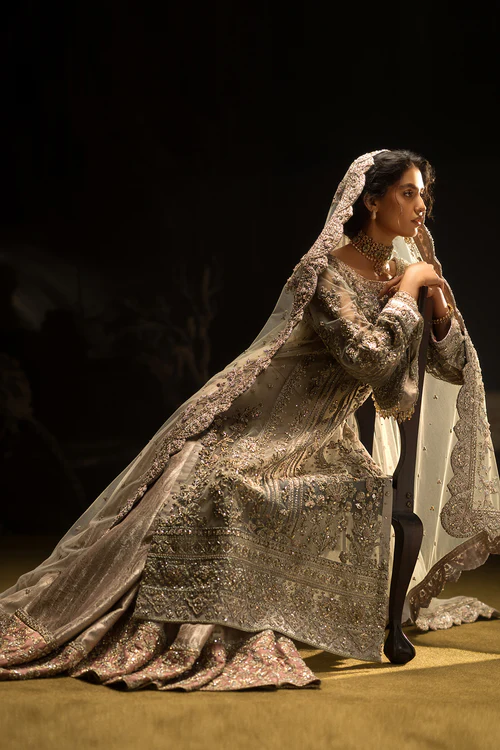Net is used for the shirt and dupatta, while the Dhaka pajama is crafted from richly textured jamawar fabric.