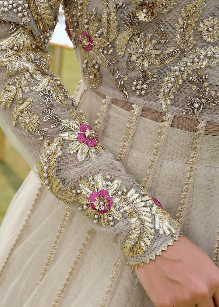 The dupatta is fashioned from coordinating ivory net, featuring delicate border embellishments and subtle golden appliqué work. Sequins, beads, and fine motifs are scattered throughout, adding soft radiance while allowing the dupatta to drape fluidly and elegantly.