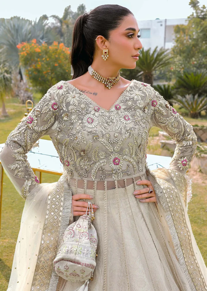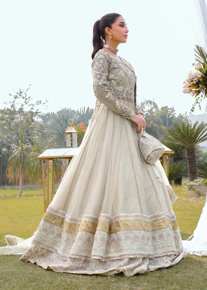 Graceful and sophisticated, this ivory ensemble features a flowing net pishwas paired with a rich jamawar lehenga and a delicate net dupatta, perfect for weddings, receptions, and festive celebrations.