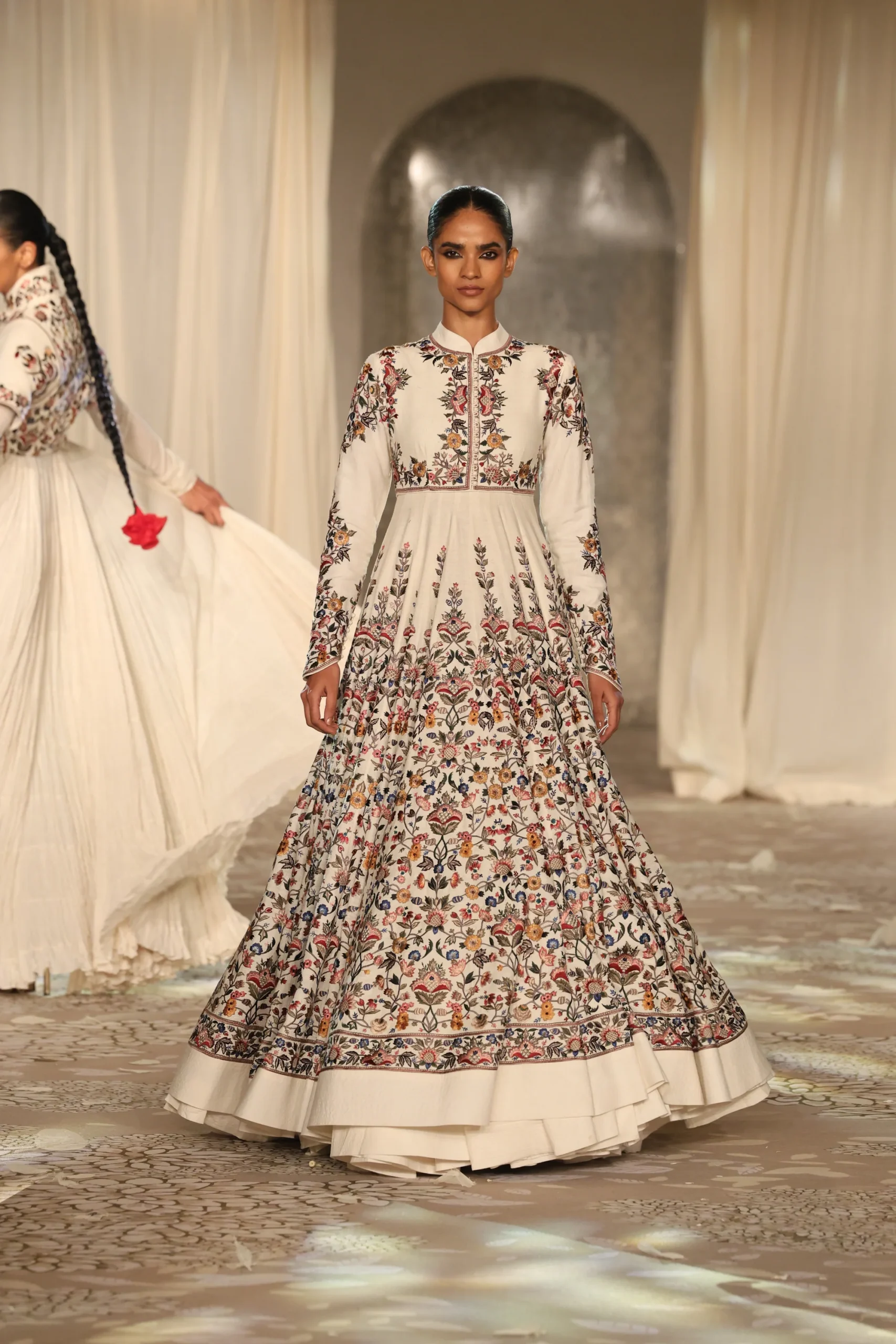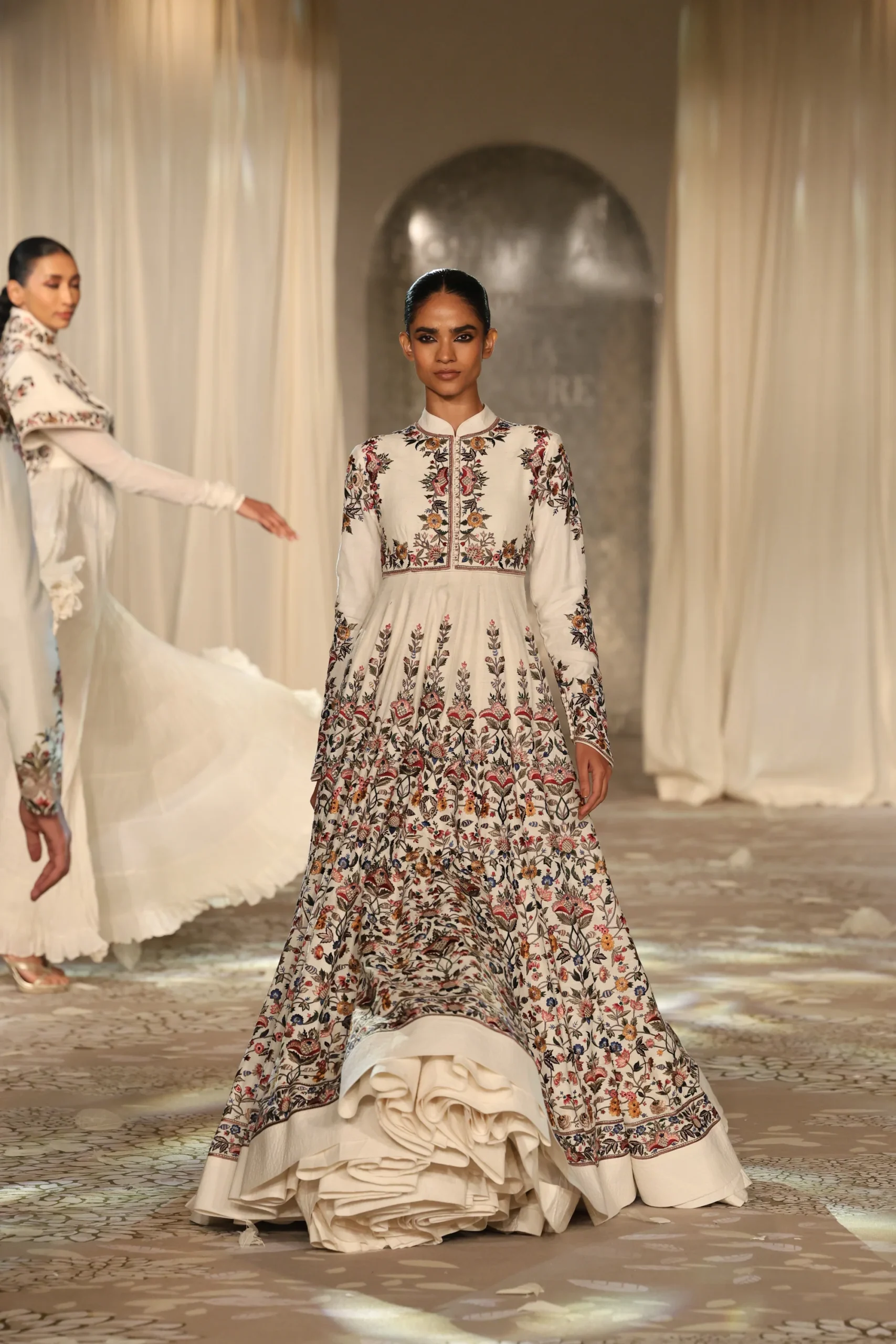 The Anarkali is crafted from matka silk in a serene ivory shade, offering a naturally textured and graceful appearance. Intricate embroidery enhances the neckline, bodice, sleeves, and hem, adding depth while maintaining subtle elegance. A soft inner lining ensures comfort and supports the majestic flare of the silhouette. The clean finishing along the edges further elevates the refined structure.