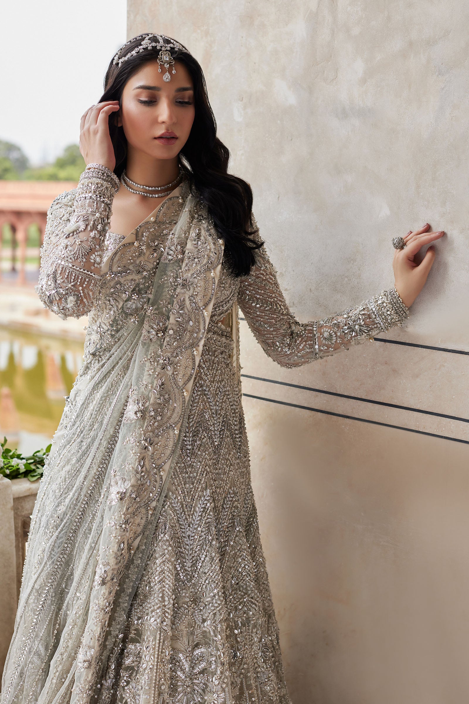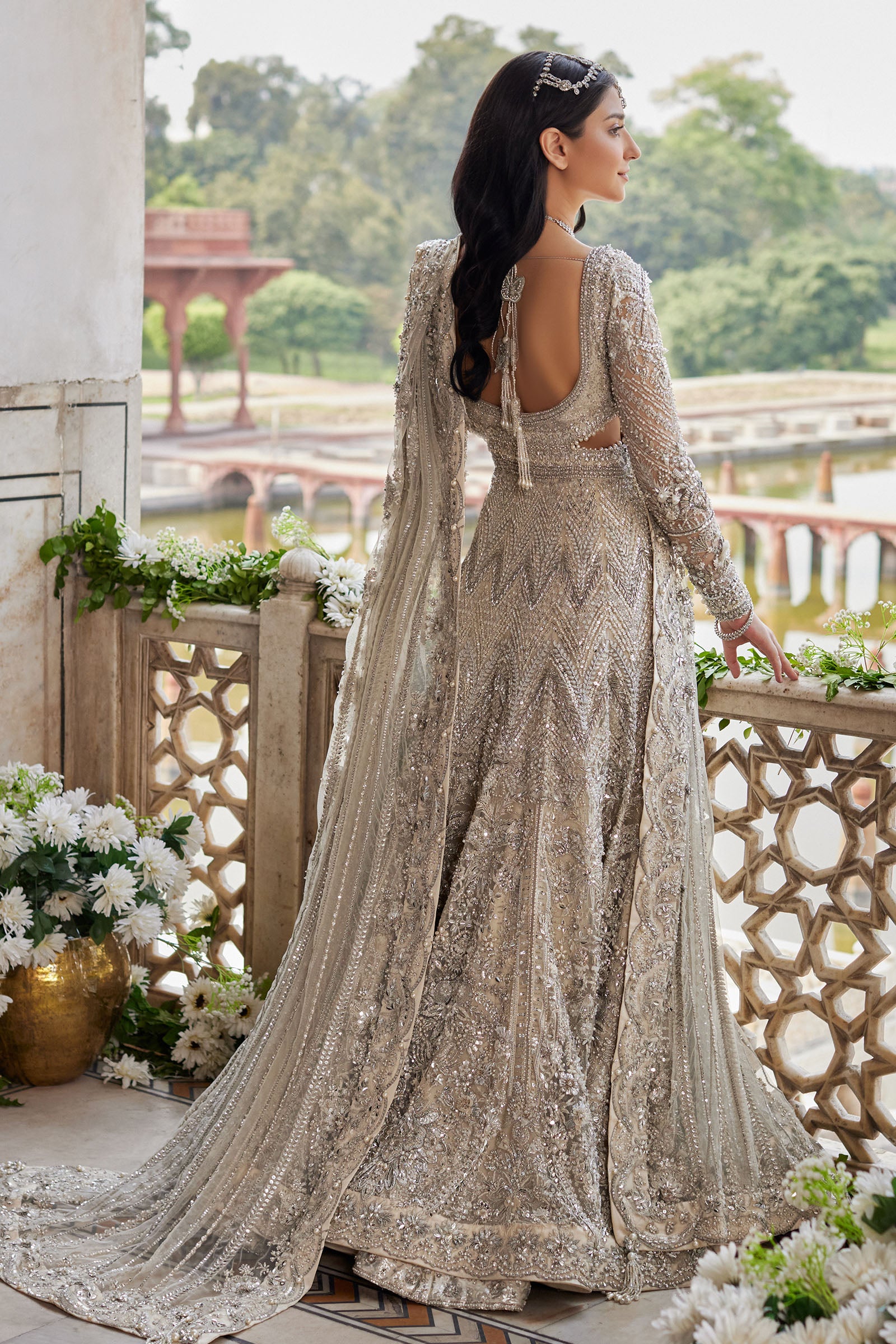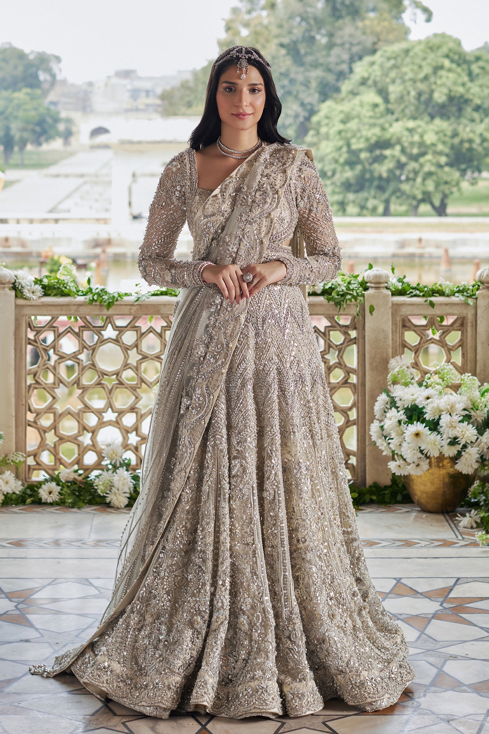 An ethereal maxi masterpiece, Minerva features a flowing ivory silhouette adorned with silver floral filigree, paired with a pearlescent sharara and an intricately embellished net dupatta for regal elegance.